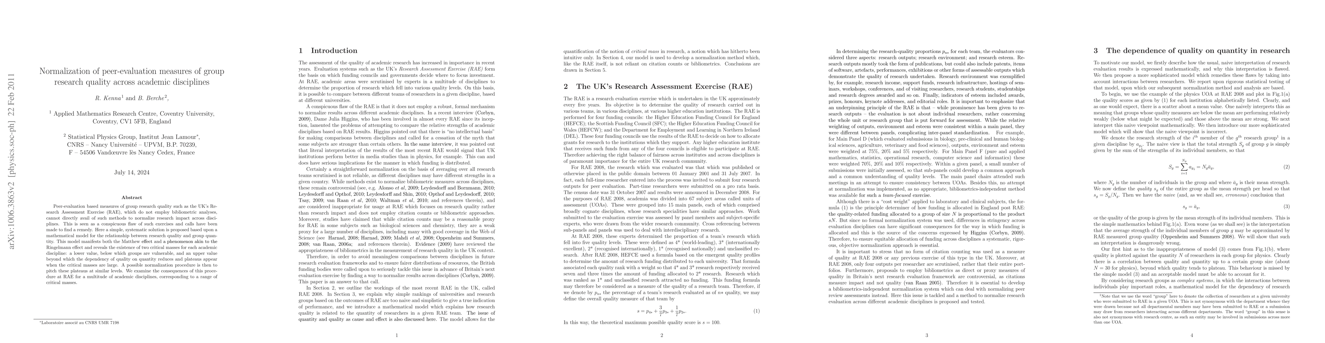 Peer-evaluation based measures of group research quality such as the UK's Research Assessment Exercise (RAE), which do not employ bibliometric analyses, cannot directly avail of such methods to normalize research impact across disciplines. This is seen as a conspicuous flaw of such exercises and calls have been made to find a remedy. Here a simple, systematic solution is proposed based upon a mathematical model for the relationship between research quality and group quantity. This model manifests both the Matthew effect and a phenomenon akin to the Ringelmann effect and reveals the existence of two critical masses for each academic discipline: a lower value, below which groups are vulnerable, and an upper value beyond which the dependency of quality on quantity reduces and plateaus appear when the critical masses are large. A possible normalization procedure is then to pitch these plateaus at similar levels. We examine the consequences of this procedure at RAE for a multitude of academic disciplines, corresponding to a range of critical masses.