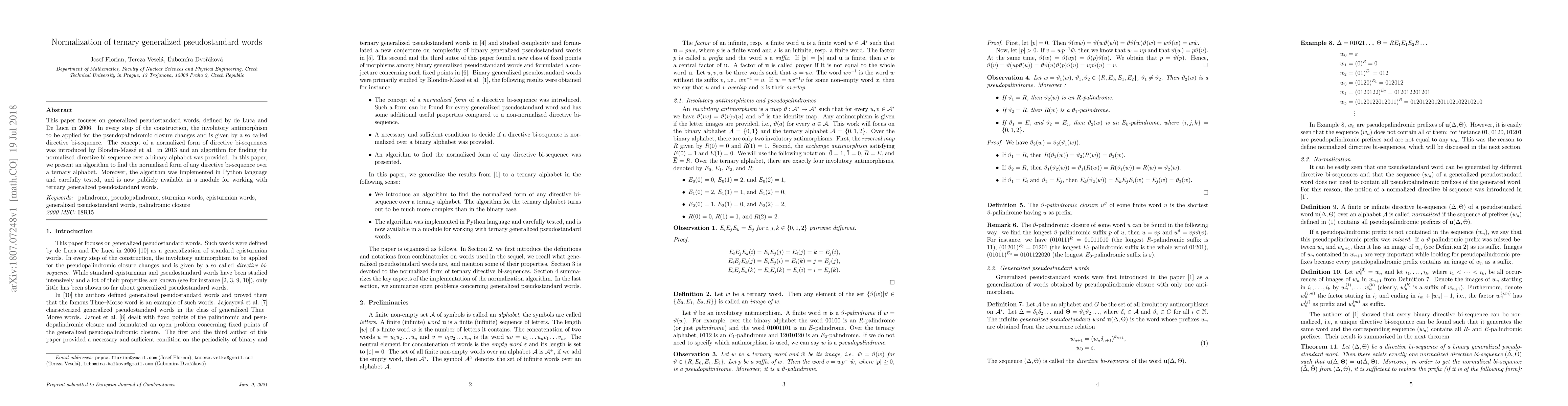 This paper focuses on generalized pseudostandard words, defined by de Luca and De Luca in 2006. In every step of the construction, the involutory antimorphism to be applied for the pseudopalindromic closure changes and is given by a so called directive bi-sequence. The concept of a normalized form of directive bi-sequences was introduced by Blondin-Mass\'e et al. in 2013 and an algorithm for finding the normalized directive bi-sequence over a binary alphabet was provided. In this paper, we present an algorithm to find the normalized form of any directive bi-sequence over a ternary alphabet. Moreover, the algorithm was implemented in Python language and carefully tested, and is now publicly available in a module for working with ternary generalized pseudostandard words.