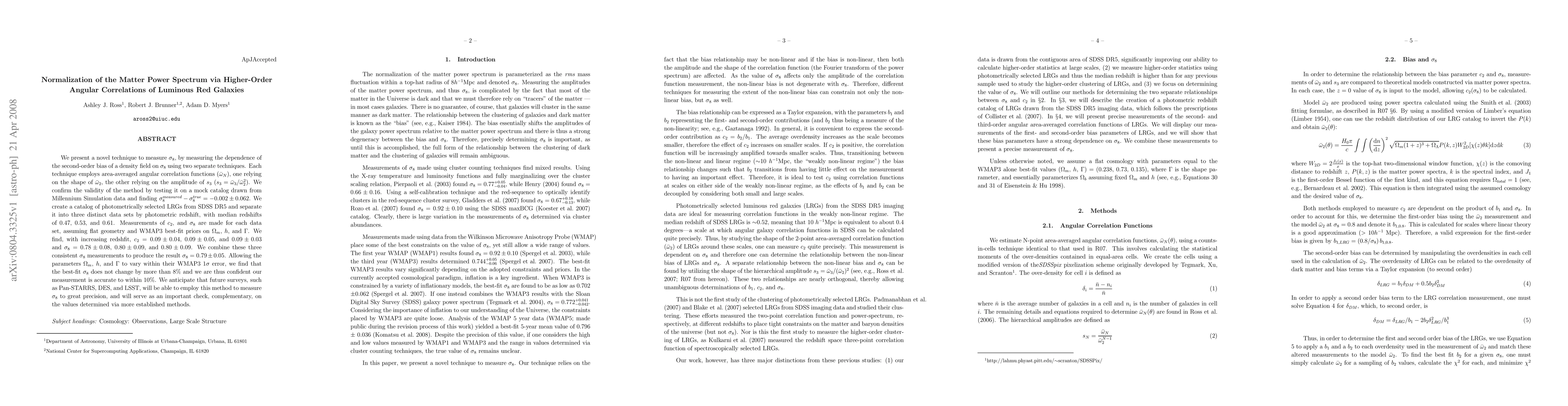 We present a novel technique to measure $\sigma_8$, by measuring the dependence of the second-order bias of a density field on $\sigma_8$ using two separate techniques. Each technique employs area-averaged angular correlation functions ($\bar{\omega}_N$), one relying on the shape of $\bar{\omega}_2$, the other relying on the amplitude of $s_3$ ($s_3 =\bar{\omega}_3/\bar{\omega}_2^2$). We confirm the validity of the method by testing it on a mock catalog drawn from Millennium Simulation data and finding $\sigma_8^{measured}- \sigma_8^{true} = -0.002 \pm 0.062$. We create a catalog of photometrically selected LRGs from SDSS DR5 and separate it into three distinct data sets by photometric redshift, with median redshifts of 0.47, 0.53, and 0.61. Measurements of $c_2$, and $\sigma_8$ are made for each data set, assuming flat geometry and WMAP3 best-fit priors on $\Omega_m$, $h$, and $\Gamma$. We find, with increasing redshfit, $c_2 = 0.09 \pm 0.04$, $0.09 \pm 0.05$, and $0.09 \pm 0.03$ and $\sigma_8 = 0.78 \pm 0.08$, $0.80 \pm 0.09$, and $0.80 \pm 0.09$. We combine these three consistent $\sigma_8$ measurements to produce the result $\sigma_8 = 0.79 \pm 0.05$. Allowing the parameters $\Omega_m$, $h$, and $\Gamma$ to vary within their WMAP3 1$\sigma$ error, we find that the best-fit $\sigma_8$ does not change by more than 8% and we are thus confident our measurement is accurate to within 10%. We anticipate that future surveys, such as Pan-STARRS, DES, and LSST, will be able to employ this method to measure $\sigma_8$ to great precision, and will serve as an important check, complementary, on the values determined via more established methods.
