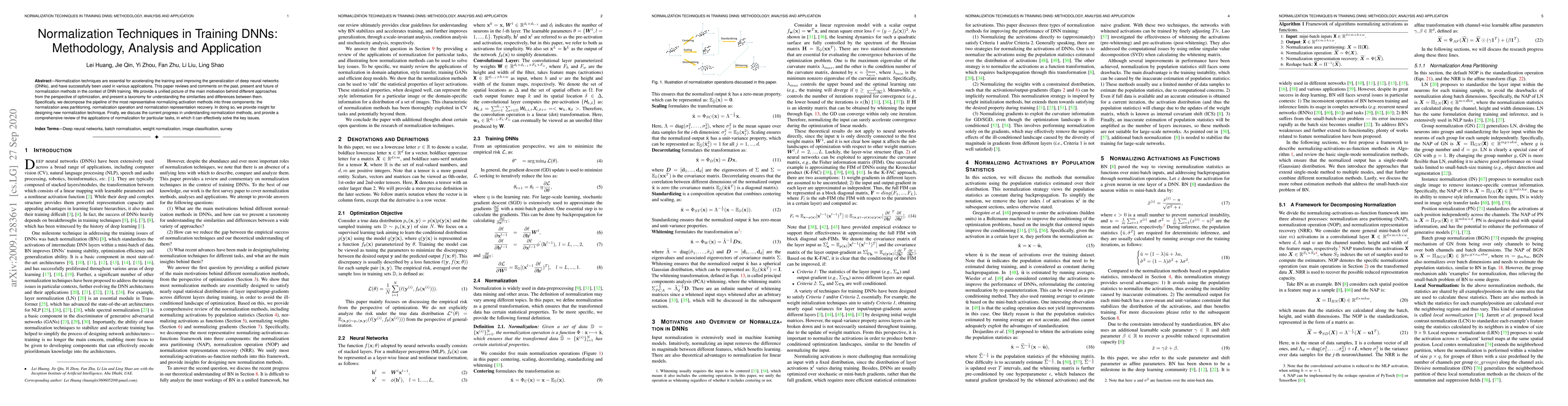 Normalization techniques are essential for accelerating the training and improving the generalization of deep neural networks (DNNs), and have successfully been used in various applications. This paper reviews and comments on the past, present and future of normalization methods in the context of DNN training. We provide a unified picture of the main motivation behind different approaches from the perspective of optimization, and present a taxonomy for understanding the similarities and differences between them. Specifically, we decompose the pipeline of the most representative normalizing activation methods into three components: the normalization area partitioning, normalization operation and normalization representation recovery. In doing so, we provide insight for designing new normalization technique. Finally, we discuss the current progress in understanding normalization methods, and provide a comprehensive review of the applications of normalization for particular tasks, in which it can effectively solve the key issues.
