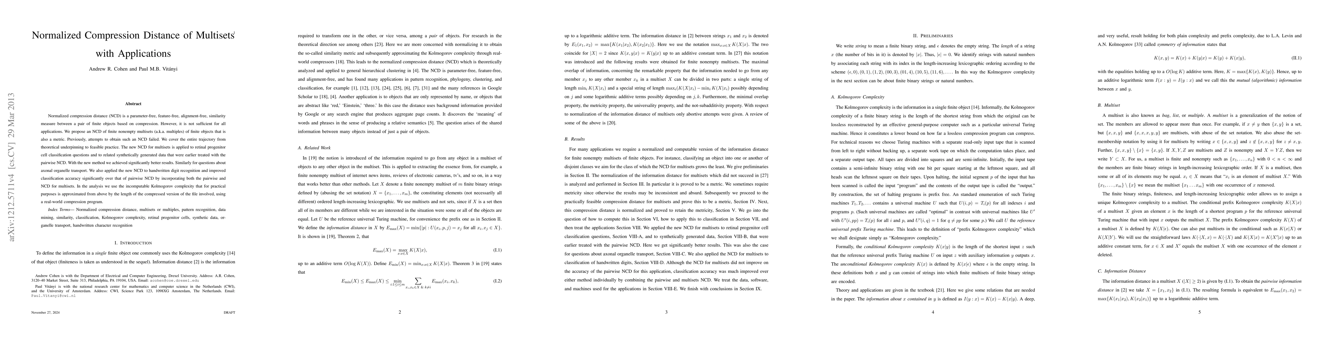 This paper introduces a new Normalized Compression Distance (NCD) for multisets, extending the traditional NCD to handle collections of objects. The new NCD significantly improves classification results in applications such as retinal progenitor cell classification, axonal organelle transport, and handwritten digit recognition compared to the traditional pairwise NCD.