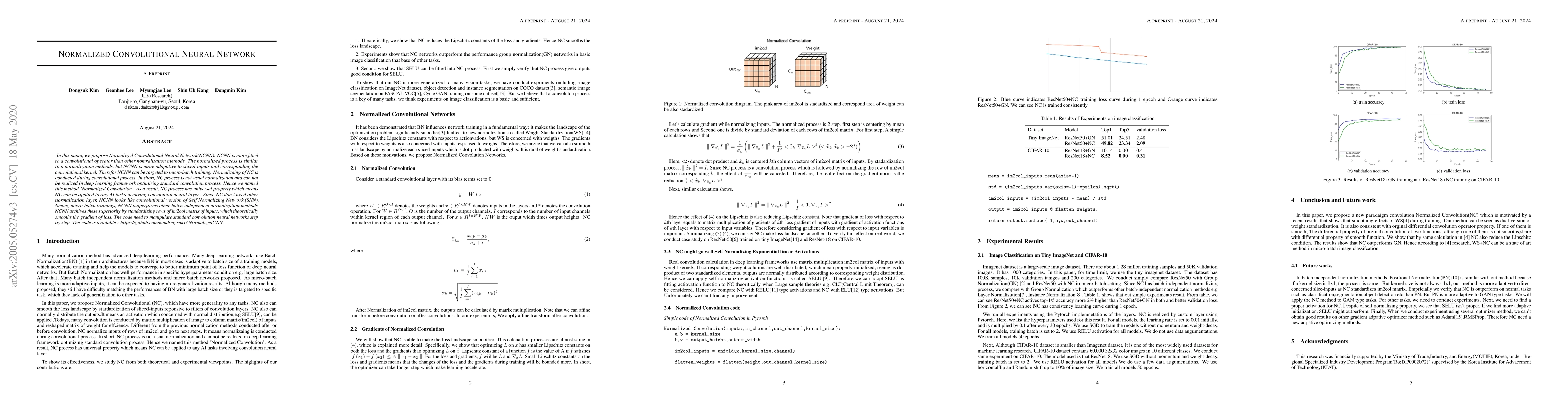 In this paper, we propose Normalized Convolutional Neural Network(NCNN). NCNN is more fitted to a convolutional operator than other nomralizaiton methods. The normalized process is similar to a normalization methods, but NCNN is more adapative to sliced-inputs and corresponding the convolutional kernel. Therefor NCNN can be targeted to micro-batch training. Normalizaing of NC is conducted during convolutional process. In short, NC process is not usual normalization and can not be realized in deep learning framework optimizing standard convolution process. Hence we named this method 'Normalized Convolution'. As a result, NC process has universal property which means NC can be applied to any AI tasks involving convolution neural layer . Since NC don't need other normalization layer, NCNN looks like convolutional version of Self Normalizing Network.(SNN). Among micro-batch trainings, NCNN outperforms other batch-independent normalization methods. NCNN archives these superiority by standardizing rows of im2col matrix of inputs, which theoretically smooths the gradient of loss. The code need to manipulate standard convolution neural networks step by step. The code is available : https://github.com/kimdongsuk1/ NormalizedCNN.