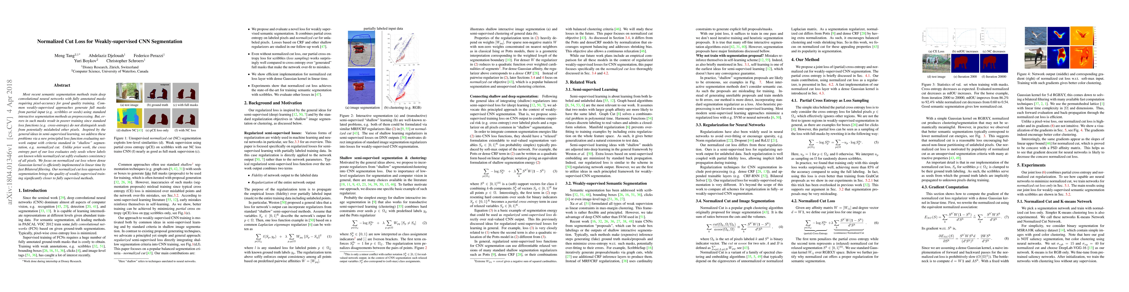 This paper proposes a new normalized cut loss function for weakly-supervised CNN segmentation, which evaluates network output using criteria from shallow segmentation methods. Unlike traditional methods, it focuses only on seed labels for cross-entropy loss while using normalized cut loss to softly evaluate consistency across all pixels, improving weakly-supervised training quality.