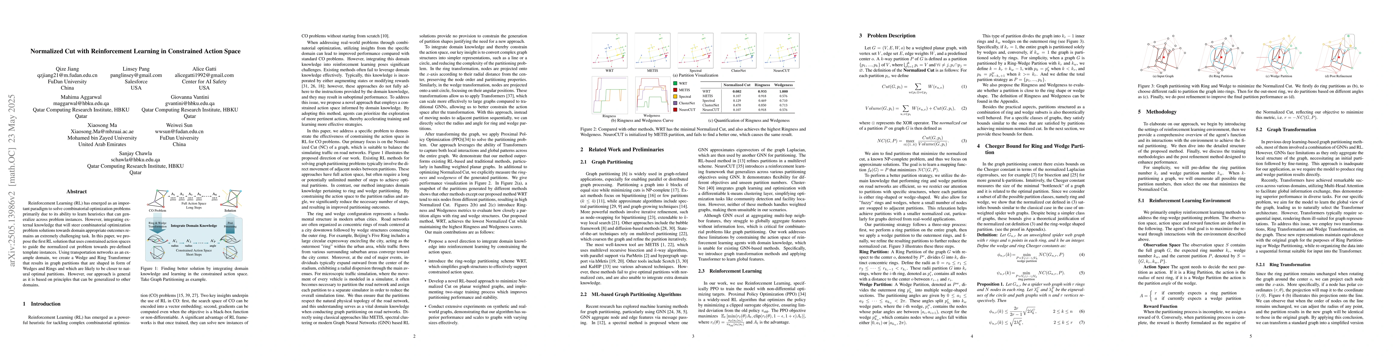 The research proposes an RL solution that employs constrained action spaces to guide the normalized cut problem towards pre-defined template instances, using a Wedge and Ring Transformer in transportation networks as an example domain.