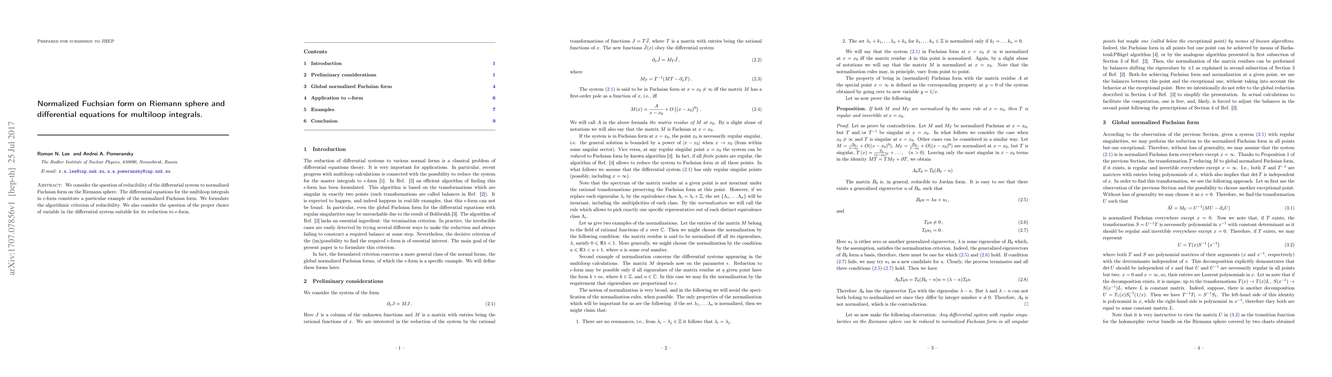 This paper explores the reducibility of differential systems to normalized Fuchsian form on the Riemann sphere, focusing on differential equations for multiloop integrals. It proposes an algorithmic criterion for reducibility and discusses the optimal choice of variable for reducing the system to $\epsilon$-form.