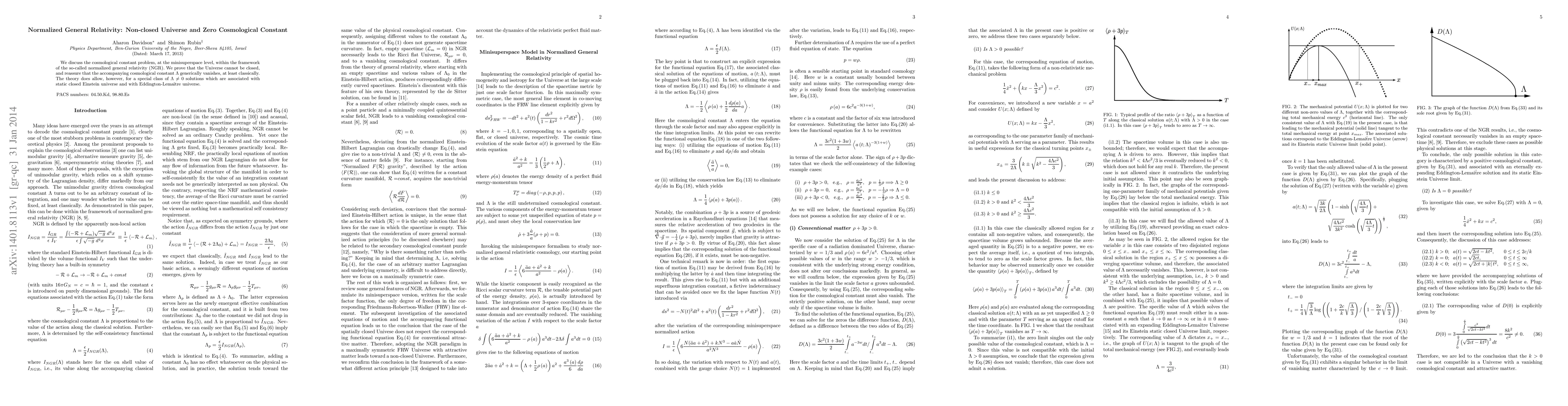 Summary: Normalized General Relativity (NGR) resolves the cosmological constant problem by proving that a non-closed universe is necessary, leading to a vanishing cosmological constant classically. However, it permits specific solutions with a non-zero cosmological constant linked to static closed and Eddington-Lemaître universes.