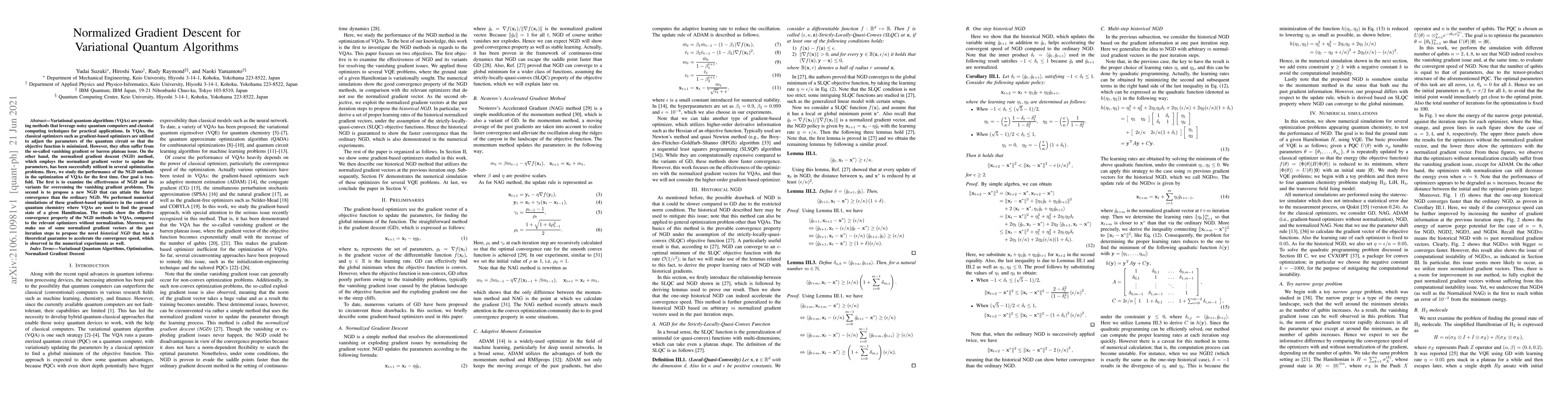 This paper investigates the application of normalized gradient descent (NGD) methods to variational quantum algorithms (VQAs) to address the vanishing gradient problem. The study demonstrates the effectiveness of NGD variants in achieving faster convergence compared to traditional optimizers, and introduces a novel historical NGD that theoretically and empirically accelerates convergence in quantum chemistry applications.
