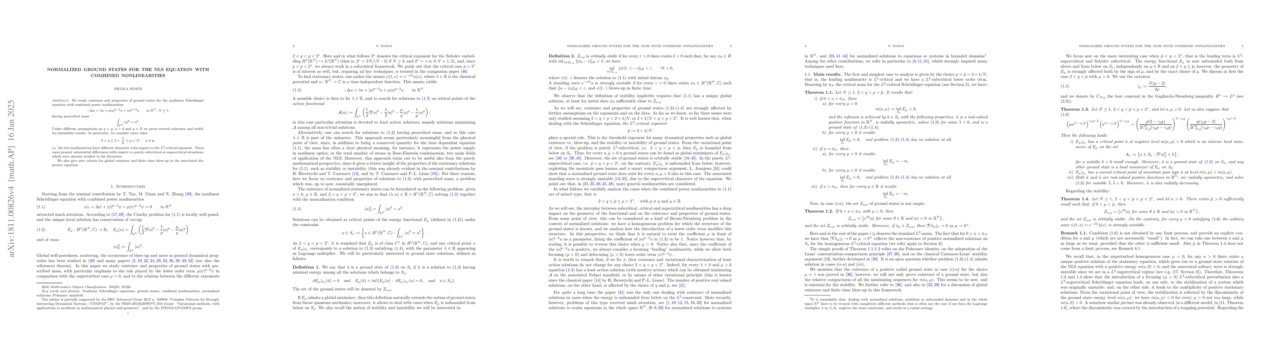 This paper investigates the existence and properties of normalized ground states for the nonlinear Schrödinger equation with mixed power nonlinearities under various conditions on parameters. It proves existence and stability/instability results for cases where the nonlinearities differ in their criticality, presenting new criteria for global existence and finite time blow-up in the associated dispersive equation.