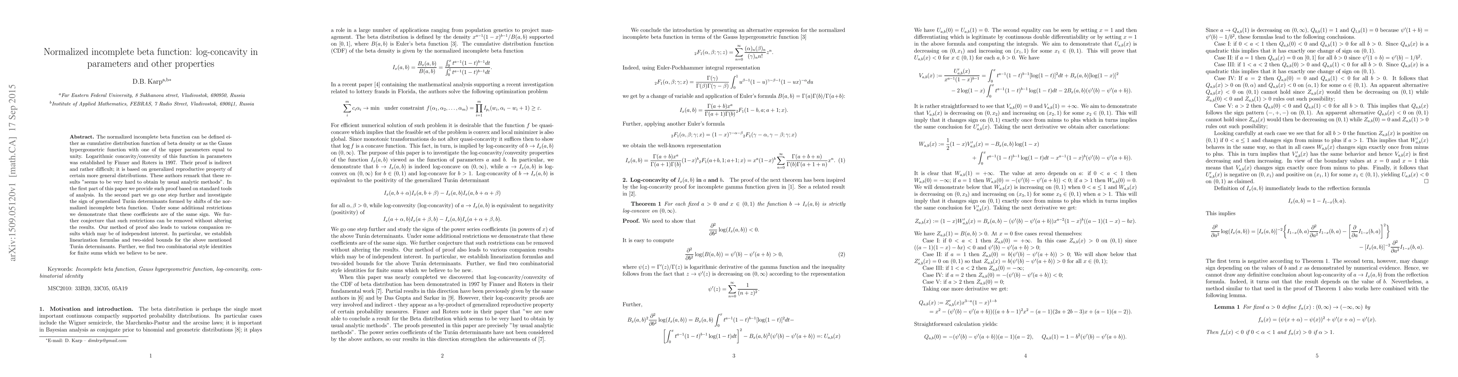 This paper provides a direct proof of the log-concavity of the normalized incomplete beta function using standard analytical tools, and extends the investigation to the sign of generalized Turán determinants formed by shifts of the function. The authors conjecture that the restrictions on these determinants can be removed and present additional results including linearization formulas, two-sided bounds, and new combinatorial identities.