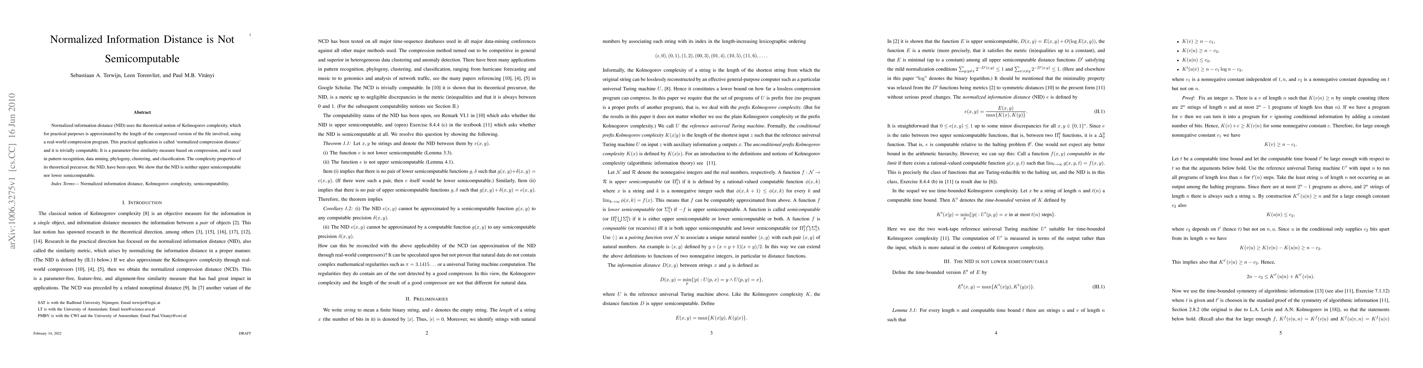 The normalized information distance (NID) is shown to be neither upper semicomputable nor lower semicomputable, challenging its practical application in pattern recognition. The practical approximation, normalized compression distance, remains trivially computable.