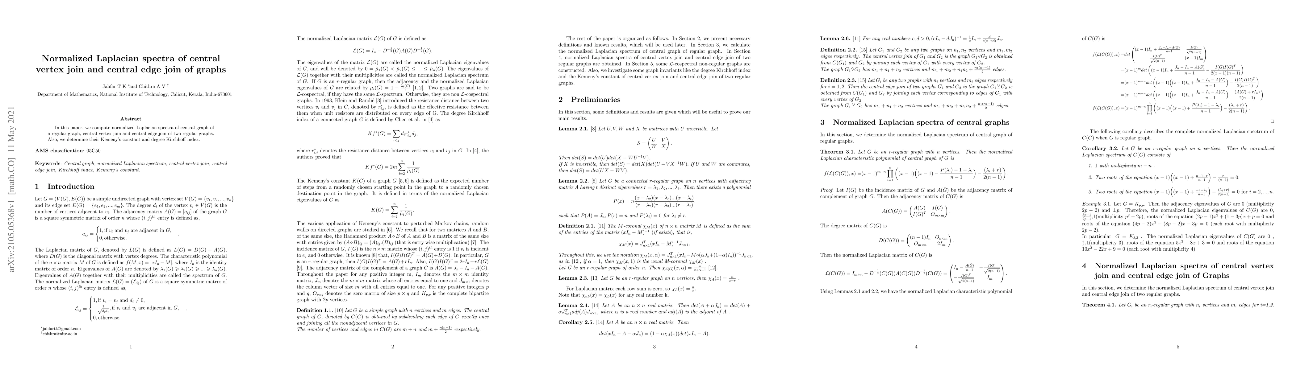 This paper computes the normalized Laplacian spectra for central graph constructs, including the central vertex join and central edge join of two regular graphs, and determines their Kemeny's constant and degree Kirchhoff index.