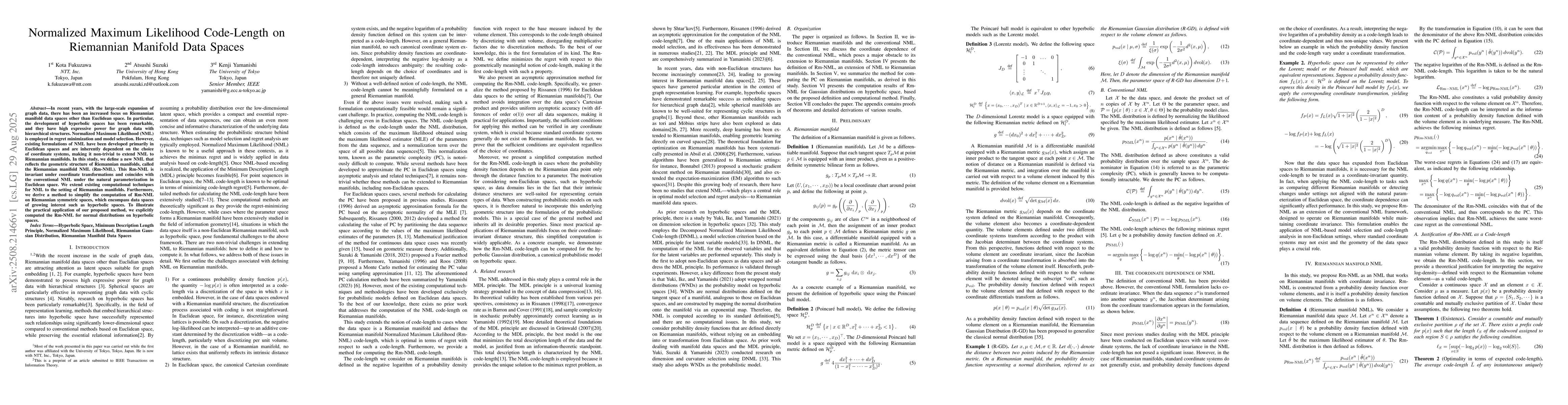 In recent years, with the large-scale expansion of graph data, there has been an increased focus on Riemannian manifold data spaces other than Euclidean space. In particular, the development of hyperbolic spaces has been remarkable, and they have high expressive power for graph data with hierarchical structures. Normalized Maximum Likelihood (NML) is employed in regret minimization and model selection. However, existing formulations of NML have been developed primarily in Euclidean spaces and are inherently dependent on the choice of coordinate systems, making it non-trivial to extend NML to Riemannian manifolds. In this study, we define a new NML that reflects the geometric structure of Riemannian manifolds, called the Riemannian manifold NML (Rm-NML). This Rm-NML is invariant under coordinate transformations and coincides with the conventional NML under the natural parameterization in Euclidean space. We extend existing computational techniques for NML to the setting of Riemannian manifolds. Furthermore, we derive a method to simplify the computation of Rm-NML on Riemannian symmetric spaces, which encompass data spaces of growing interest such as hyperbolic spaces. To illustrate the practical application of our proposed method, we explicitly computed the Rm-NML for normal distributions on hyperbolic spaces.