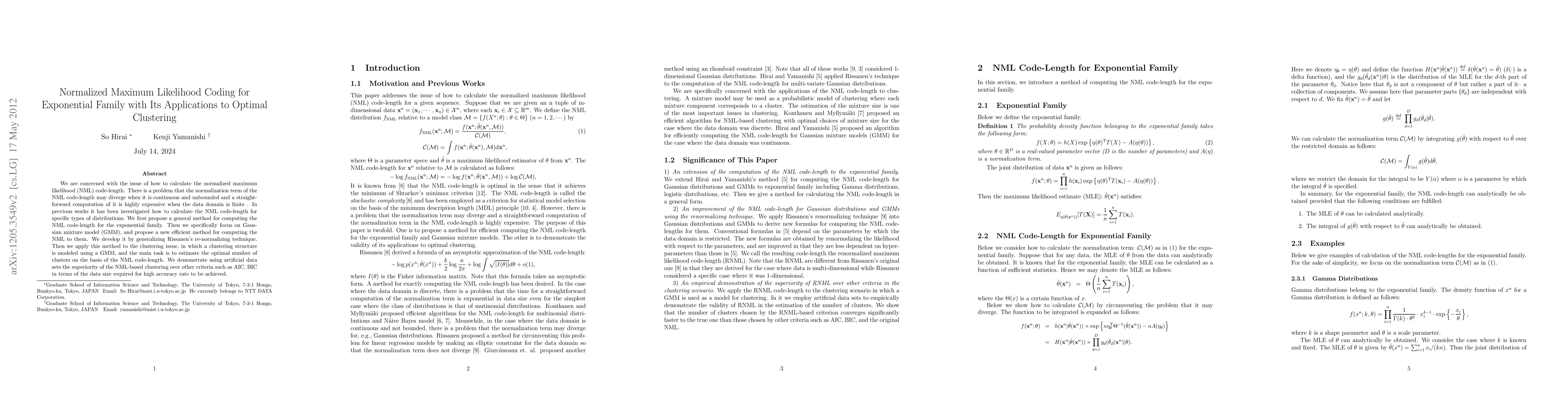 We are concerned with the issue of how to calculate the normalized maximum likelihood (NML) code-length. There is a problem that the normalization term of the NML code-length may diverge when it is continuous and unbounded and a straightforward computation of it is highly expensive when the data domain is finite . In previous works it has been investigated how to calculate the NML code-length for specific types of distributions. We first propose a general method for computing the NML code-length for the exponential family. Then we specifically focus on Gaussian mixture model (GMM), and propose a new efficient method for computing the NML to them. We develop it by generalizing Rissanen's re-normalizing technique. Then we apply this method to the clustering issue, in which a clustering structure is modeled using a GMM, and the main task is to estimate the optimal number of clusters on the basis of the NML code-length. We demonstrate using artificial data sets the superiority of the NML-based clustering over other criteria such as AIC, BIC in terms of the data size required for high accuracy rate to be achieved.