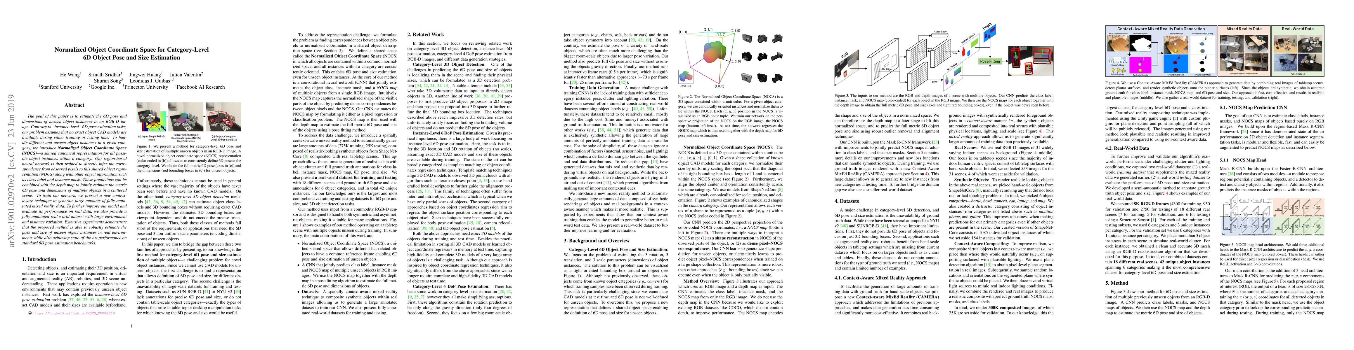This paper proposes a Normalized Object Coordinate Space (NOCS) for estimating the 6D pose and size of unseen object instances in RGB-D images without requiring CAD models. The method uses a region-based neural network to infer correspondences from observed pixels to the NOCS, achieving state-of-the-art performance on benchmarks.