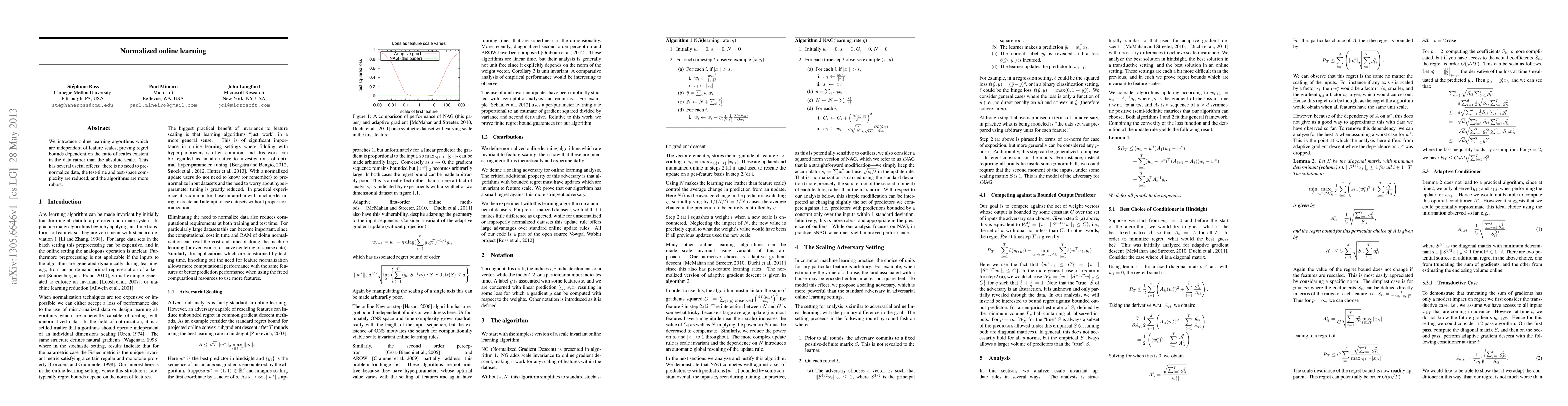 We introduce online learning algorithms which are independent of feature scales, proving regret bounds dependent on the ratio of scales existent in the data rather than the absolute scale. This has several useful effects: there is no need to pre-normalize data, the test-time and test-space complexity are reduced, and the algorithms are more robust.