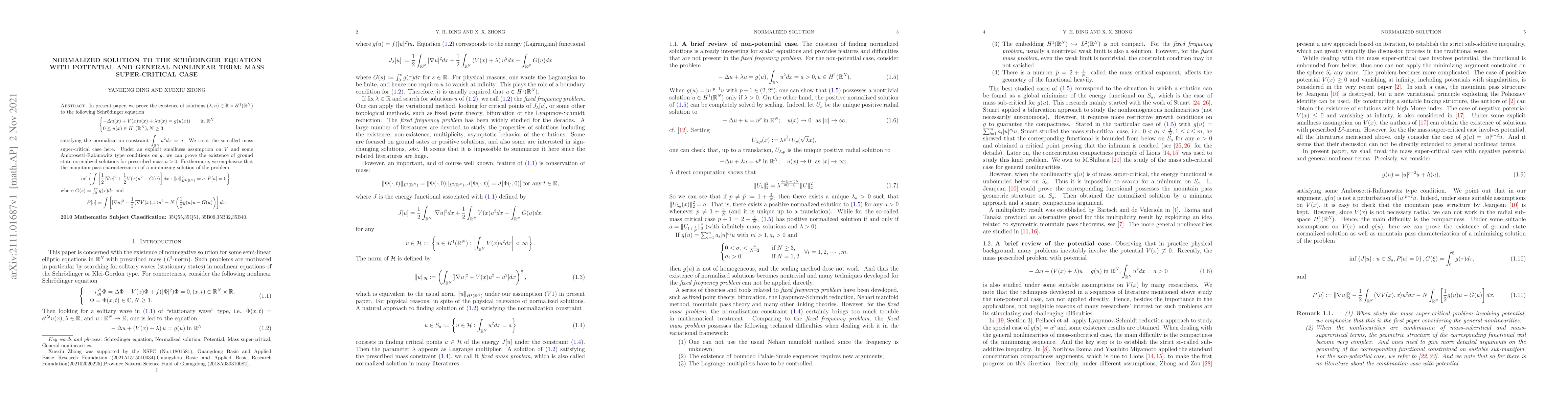 This paper proves the existence of normalized solutions $(\lambda, u)$ to a super-critical mass Schrödinger equation with a potential and a general nonlinear term, satisfying $\int_{\R^N}u^2 dx=a$. Under specific smallness conditions on $V$ and Ambrosetti-Rabinowitz conditions on $g$, ground state solutions are shown to exist for prescribed mass $a>0$.