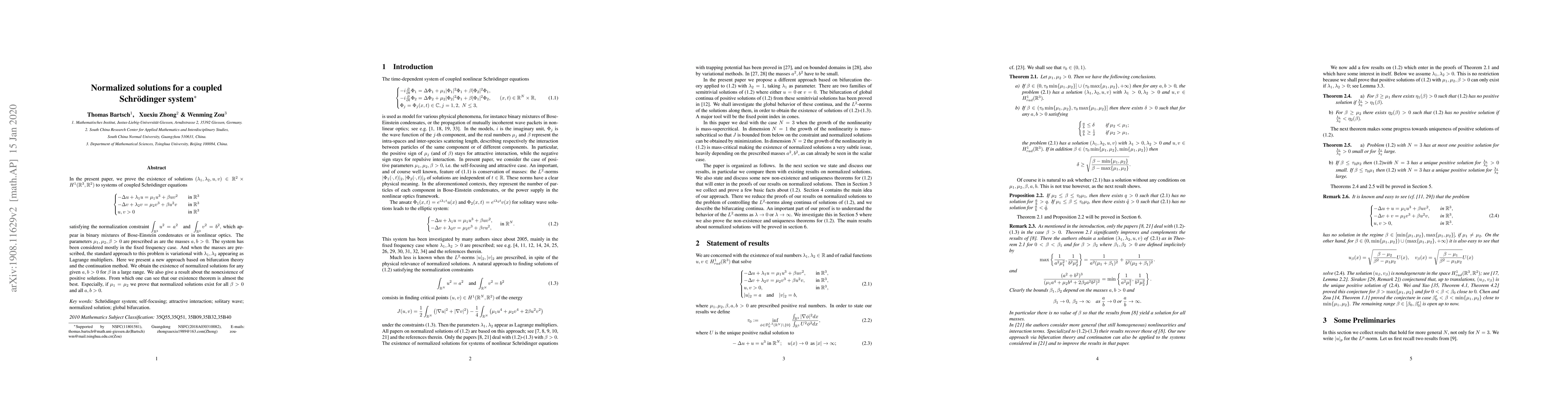 This paper proves the existence of normalized solutions for a coupled Schrödinger system describing binary mixtures of Bose-Einstein condensates or nonlinear optics, using a new approach based on bifurcation theory and the continuation method. The authors demonstrate the existence of solutions for any given masses under certain conditions on the parameters.