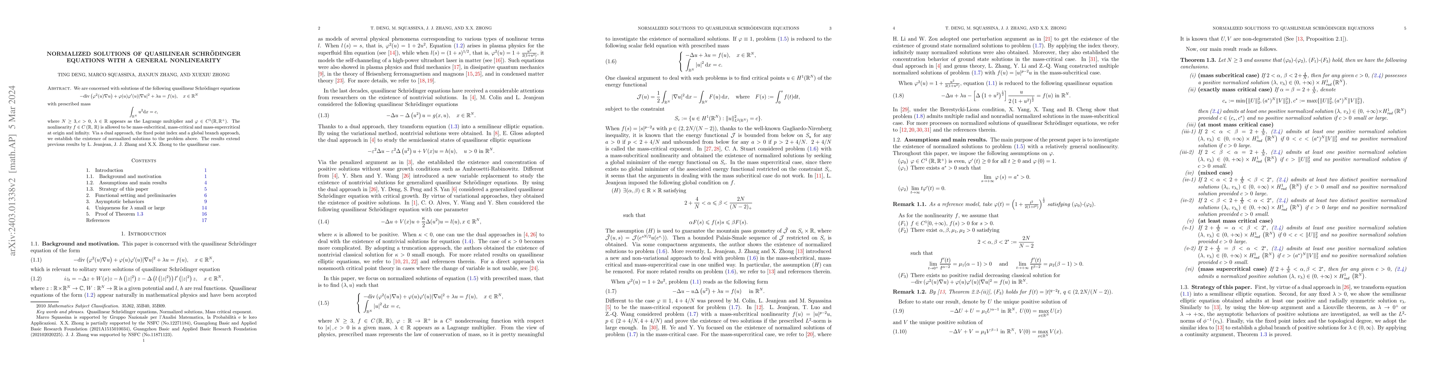 This paper investigates quasilinear Schrödinger equations with a general nonlinearity, establishing the existence of normalized solutions under prescribed mass constraints. Utilizing a dual approach and global branch method, it extends previous results to cover mass-subcritical, mass-critical, and mass-supercritical nonlinearities.
