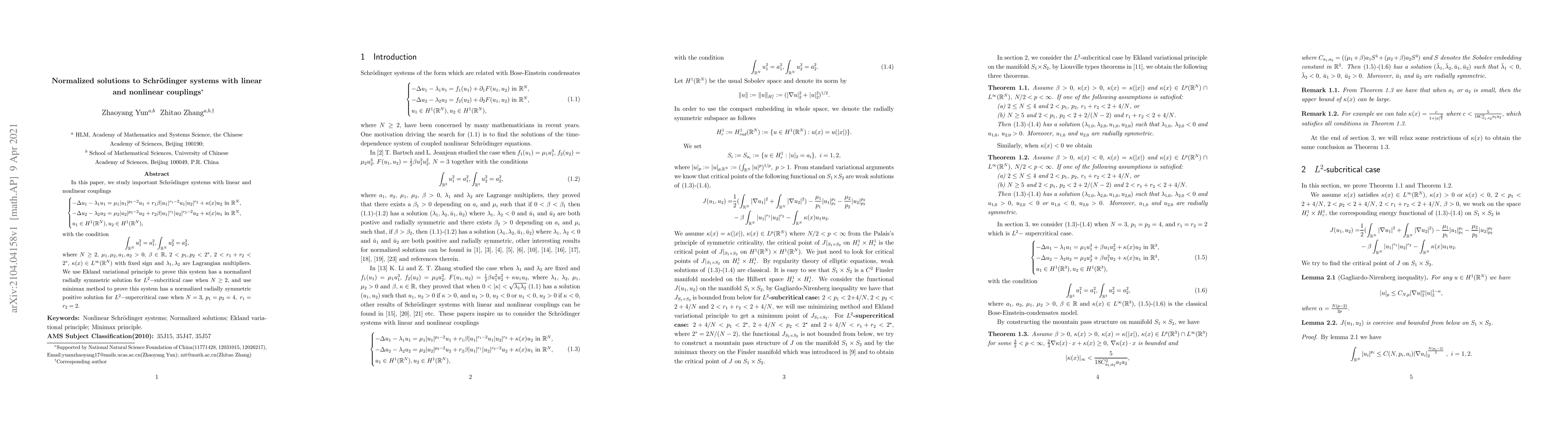 This paper proves the existence of normalized radially symmetric solutions to Schrödinger systems with linear and nonlinear couplings for specific cases, using both Ekland's variational principle and the minimax method.