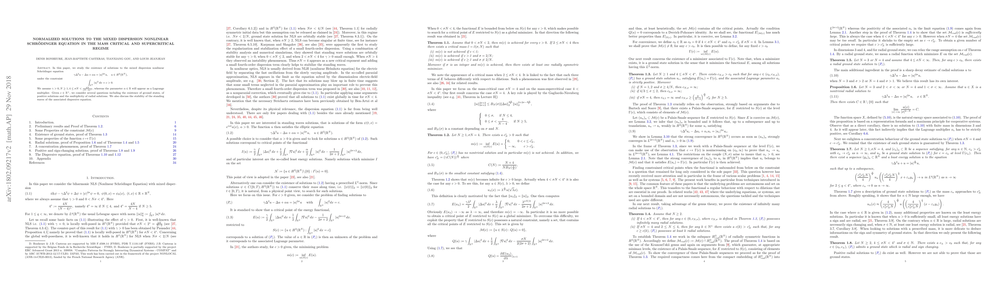In this paper, we study the existence of solutions to the mixed dispersion nonlinear Schr\"odinger equation $$ \gamma \Delta ^2 u -\Delta u + \alpha u=|u|^{2 \sigma} u, \quad u \in H^2(\R^N), $$ under the constraint $$ \int_{\R^N}|u|^2 \, dx =c>0. $$ We assume $\gamma >0, N \geq 1, 4 \leq \sigma N < \frac{4N}{(N-4)^+}$, whereas the parameter $\alpha \in \R$ will appear as a Lagrange multiplier. Given $c \in \R^+$, we consider several questions including the existence of ground states, of positive solutions and the multiplicity of radial solutions. We also discuss the stability of the standing waves of the associated dispersive equation.