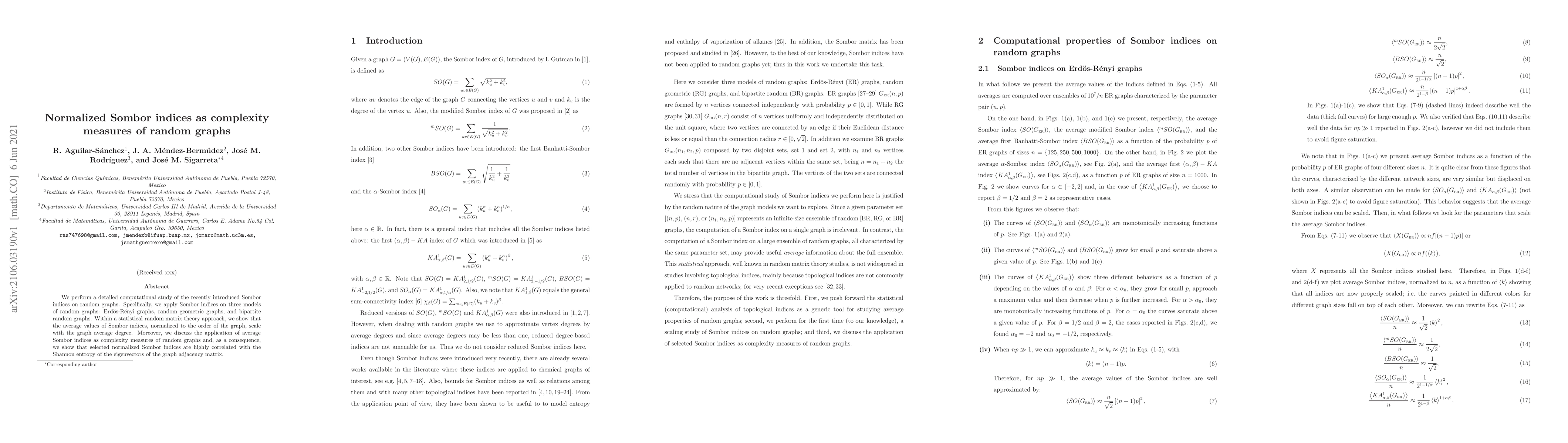 We perform a detailed computational study of the recently introduced Sombor indices on random graphs. Specifically, we apply Sombor indices on three models of random graphs: Erd\"os-R\'enyi graphs, random geometric graphs, and bipartite random graphs. Within a statistical random matrix theory approach, we show that the average values of Sombor indices, normalized to the order of the graph, scale with the graph average degree. Moreover, we discuss the application of average Sombor indices as complexity measures of random graphs and, as a consequence, we show that selected normalized Sombor indices are highly correlated with the Shannon entropy of the eigenvectors of the graph adjacency matrix.