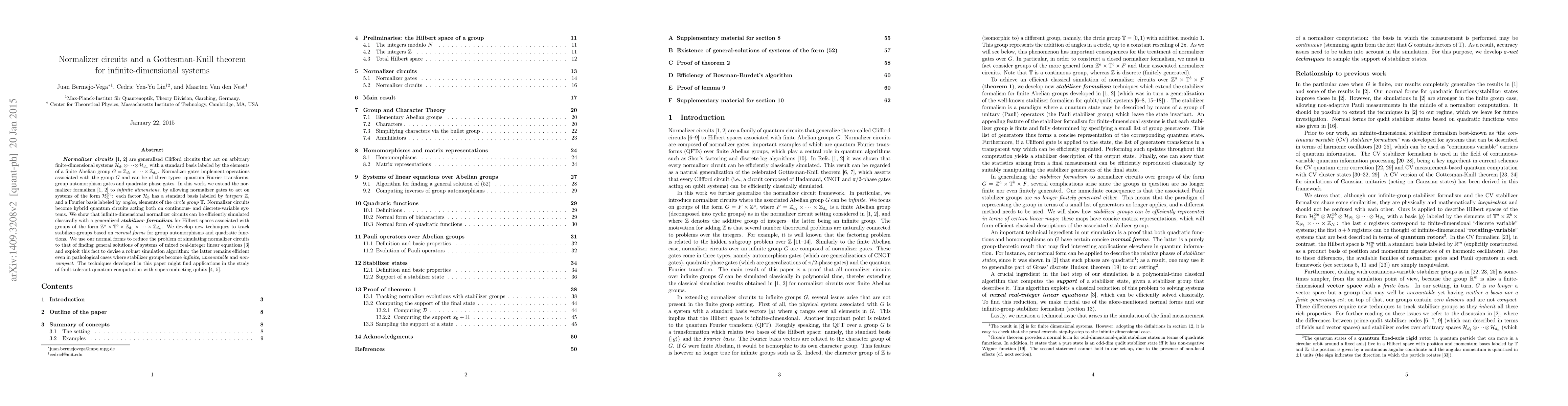 This paper extends the normalizer formalism to infinite-dimensional quantum systems, allowing for hybrid quantum circuits that operate on both continuous and discrete variables. It introduces a generalized stabilizer formalism to efficiently simulate these circuits, even in complex cases where stabilizer groups are infinite and non-compact.