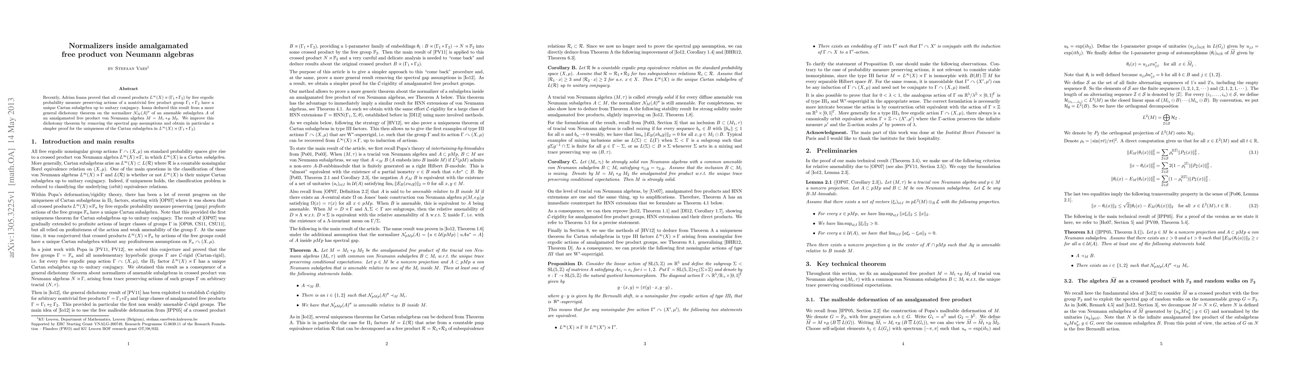 Recently, Adrian Ioana proved that all crossed products by free ergodic probability measure preserving actions of a nontrivial free product group \Gamma_1 * \Gamma_2 have a unique Cartan subalgebra up to unitary conjugacy. Ioana deduced this result from a more general dichotomy theorem on the normalizer N_M(A)'' of an amenable subalgebra A of an amalgamated free product von Neumann algebra M = M_1 *_B M_2. We improve this dichotomy theorem by removing the spectral gap assumptions and obtain in particular a simpler proof for the uniqueness of the Cartan subalgebra in crossed products by \Gamma_1 * \Gamma_2.