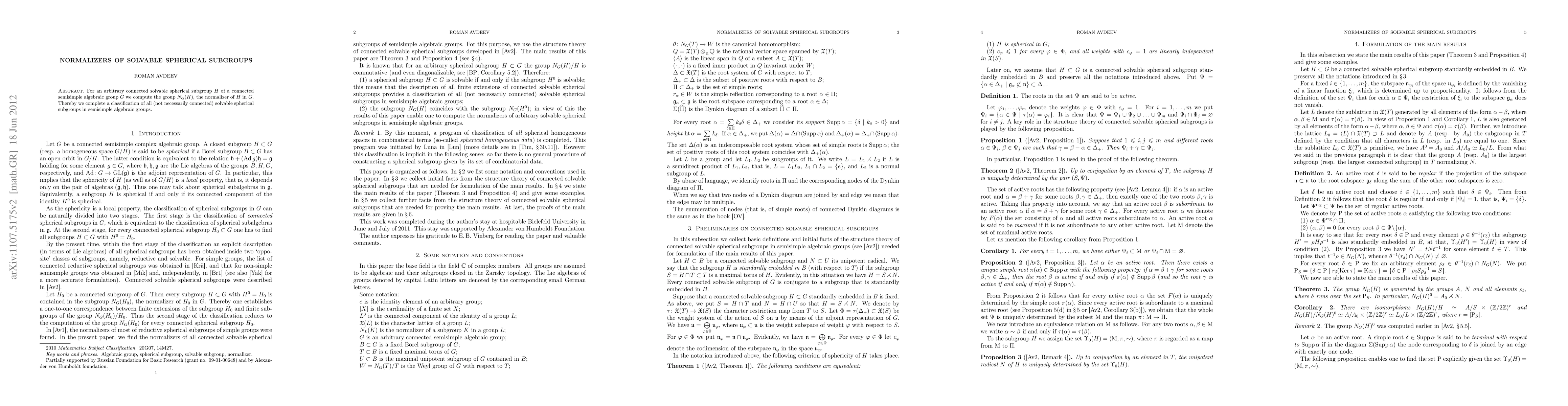 This research paper computes the normalizer group N_G(H) for any connected solvable spherical subgroup H within a connected semisimple algebraic group G, thus completing the classification of all solvable spherical subgroups in these groups.