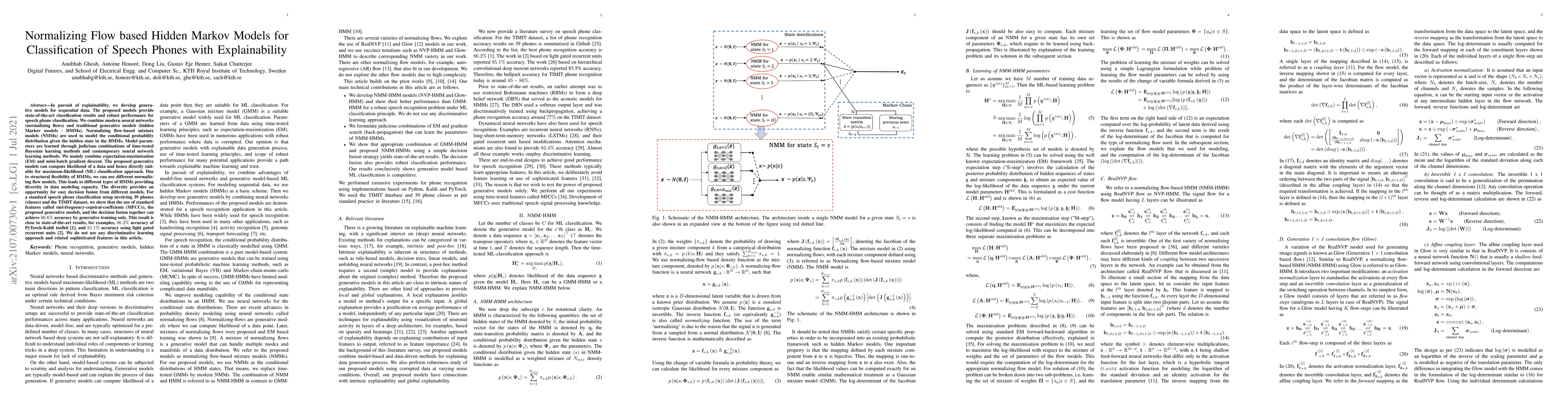 In pursuit of explainability, we develop generative models for sequential data. The proposed models provide state-of-the-art classification results and robust performance for speech phone classification. We combine modern neural networks (normalizing flows) and traditional generative models (hidden Markov models - HMMs). Normalizing flow-based mixture models (NMMs) are used to model the conditional probability distribution given the hidden state in the HMMs. Model parameters are learned through judicious combinations of time-tested Bayesian learning methods and contemporary neural network learning methods. We mainly combine expectation-maximization (EM) and mini-batch gradient descent. The proposed generative models can compute likelihood of a data and hence directly suitable for maximum-likelihood (ML) classification approach. Due to structural flexibility of HMMs, we can use different normalizing flow models. This leads to different types of HMMs providing diversity in data modeling capacity. The diversity provides an opportunity for easy decision fusion from different models. For a standard speech phone classification setup involving 39 phones (classes) and the TIMIT dataset, we show that the use of standard features called mel-frequency-cepstral-coeffcients (MFCCs), the proposed generative models, and the decision fusion together can achieve $86.6\%$ accuracy by generative training only. This result is close to state-of-the-art results, for examples, $86.2\%$ accuracy of PyTorch-Kaldi toolkit [1], and $85.1\%$ accuracy using light gated recurrent units [2]. We do not use any discriminative learning approach and related sophisticated features in this article.