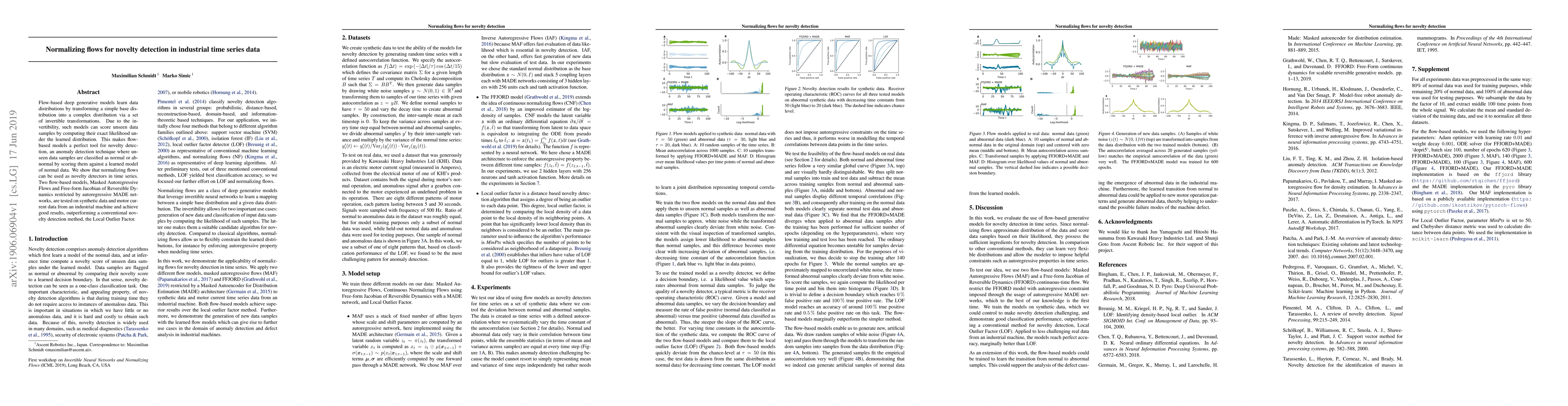 This paper explores the use of normalizing flows for novelty detection in industrial time series data, demonstrating that these invertible transformation-based models can effectively classify unseen data as normal or abnormal. The study tests two flow-based models on synthetic and real motor current data, showing superior performance compared to the Local Outlier Factor method.
