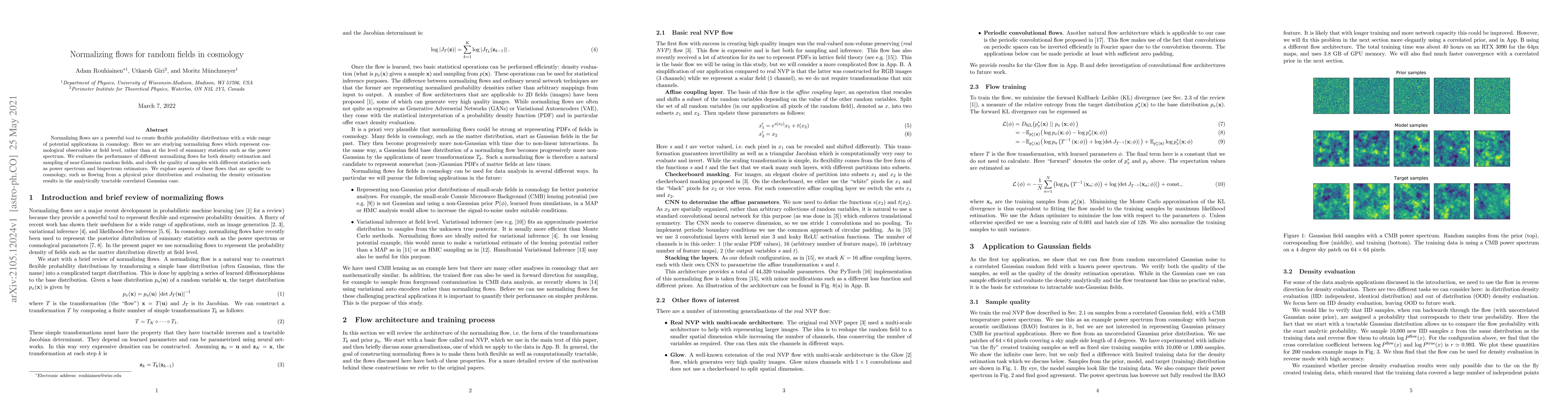 This paper investigates normalizing flows for modeling cosmological observables as random fields, evaluating their performance in density estimation and sampling. It assesses the quality of generated samples using power spectrum and bispectrum estimators, focusing on cosmologically relevant aspects like physical prior distributions and correlated Gaussian cases.