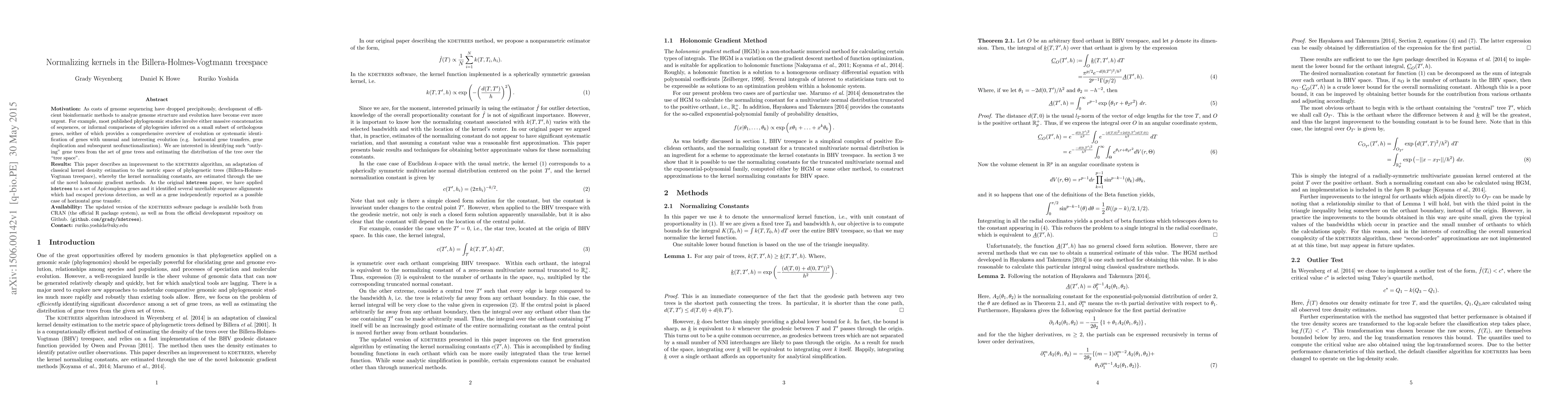This paper improves the kdetrees algorithm for analyzing phylogenetic trees in Billera-Holmes-Vogtmann treespace using novel holonomic gradient methods to estimate kernel normalizing constants. It successfully identified unreliable sequence alignments and a gene possibly involved in horizontal gene transfer in a set of Apicomplexa genes.