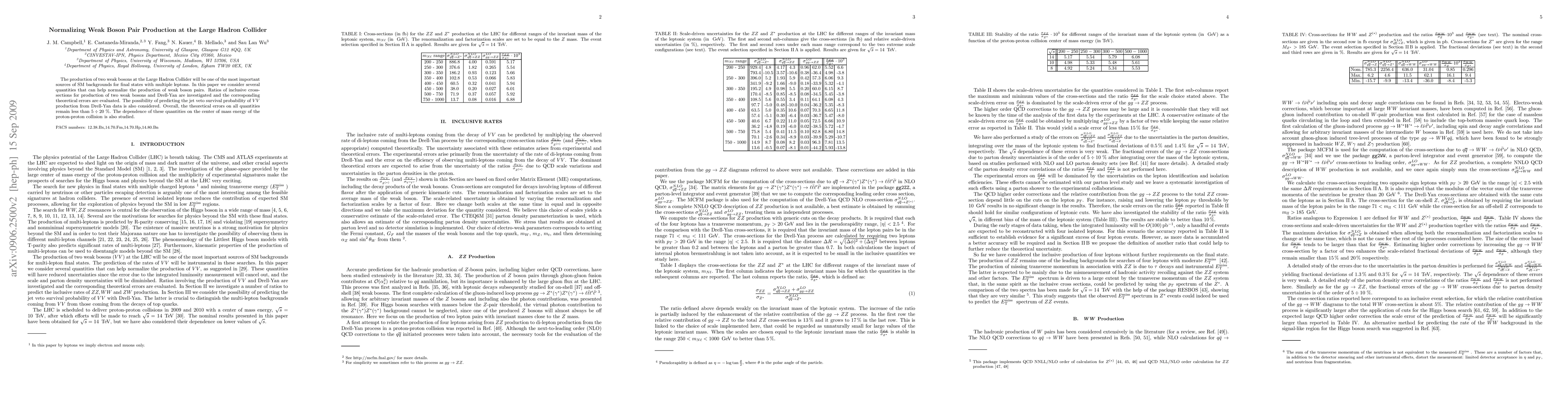 The production of two weak bosons at the Large Hadron Collider will be one of the most important sources of SM backgrounds for final states with multiple leptons. In this paper we consider several quantities that can help normalize the production of weak boson pairs. Ratios of inclusive cross-sections for production of two weak bosons and Drell-Yan are investigated and the corresponding theoretical errors are evaluated. The possibility of predicting the jet veto survival probability of VV production from Drell-Yan data is also considered. Overall, the theoretical errors on all quantities remain less than 5-20%. The dependence of these quantities on the center of mass energy of the proton-proton collision is also studied.