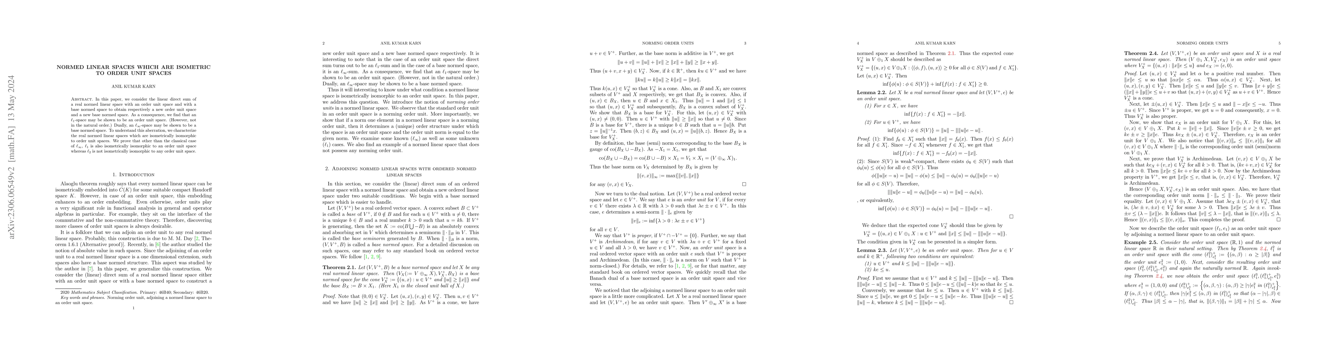 In this paper, we consider the linear direct sum of a real normed linear space with an order unit space and with a base normed space to obtain respectively a new order unit space and a new base normed space. As a consequence, we find that an $\ell_1$-space may be shown to be an order unit space. (However, not in the natural order.) Dually, an $\ell_{\infty}$-space may be shown to be a base normed space. To understand this aberration, we characterize the real normed linear spaces which are isometrically isomorphic to order unit spaces. We prove that other than the classical case of $\ell_{\infty}$, $\ell_1$ is also isometrically isomorphic to an order unit space whereas $\ell_2$ is not isometrically isomorphic to any order unit space.