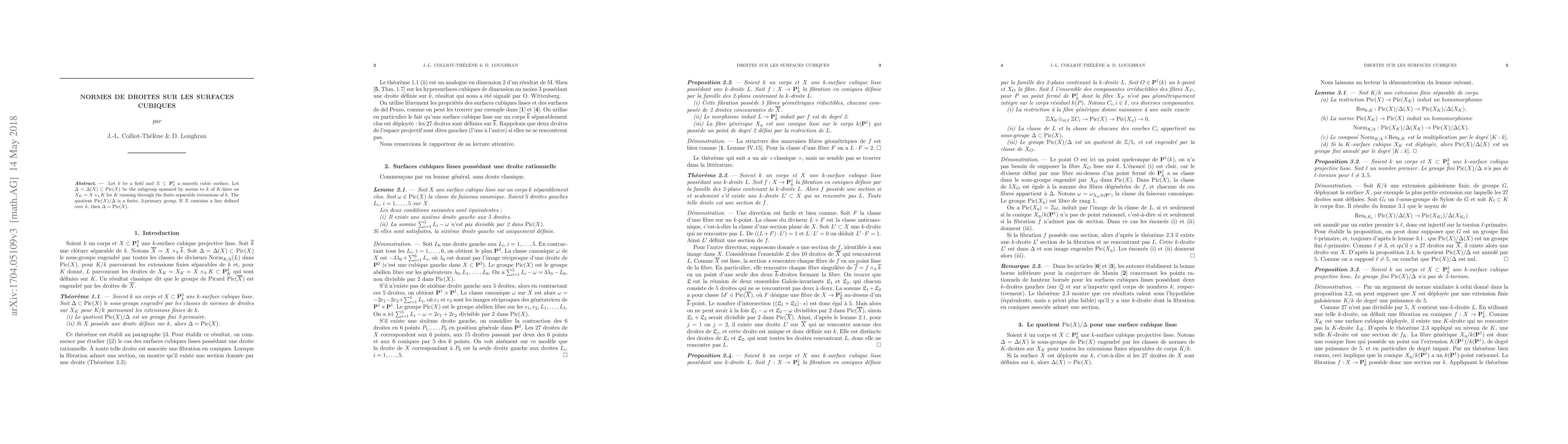 Let $k$ be a field and $X \subset P^3_{k}$ a smooth cubic surface. Let $\Delta \subset Pic(X)$ be the finite index subgroup spanned by norms of lines on $X_{K}$ for $K$ running through the finite separable extensions of $k$. The quotient $Pic(X)/\Delta$ is 3-primary. If $X$ contains a line defined over $k$, then $\Delta=Pic(X)$.