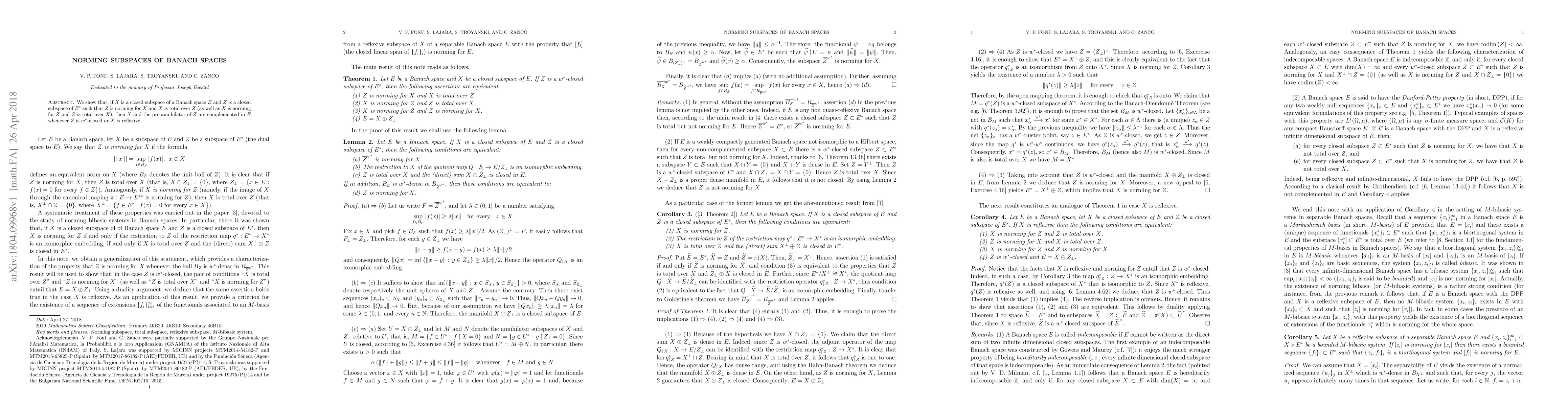 A Banach space X is complemented in E if it has a closed complementation; the paper shows this occurs under specific conditions involving norming subspaces and w*-closed subspaces.