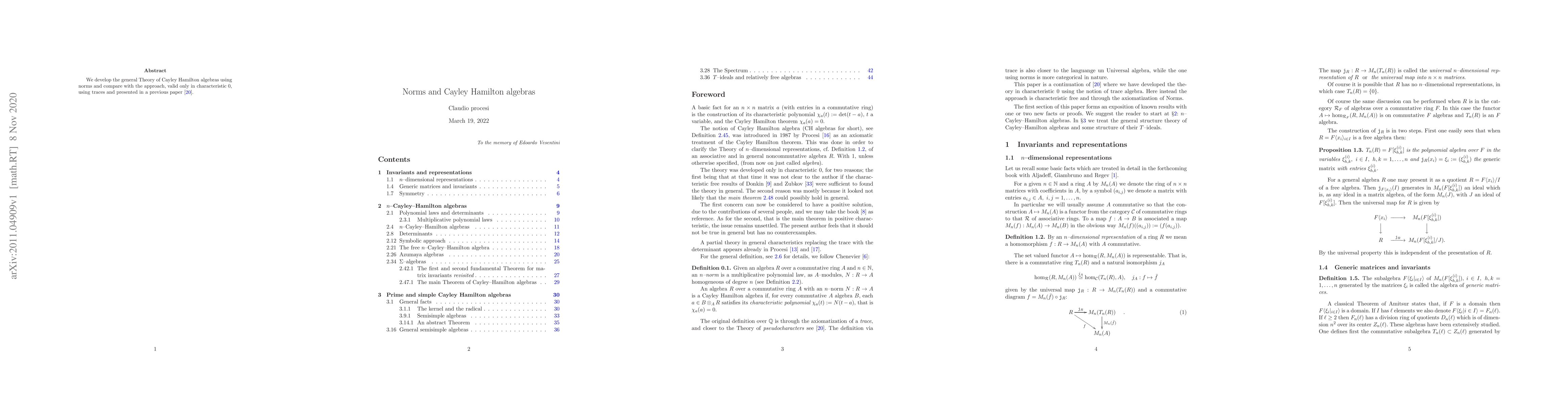 We develop the general Theory of Cayley Hamilton algebras using norms and compare with the approach, valid only in characteristic 0, using traces and presented in a previous paper $T$-ideals of Cayley Hamilton algebras, 2020, arXiv:2008.02222