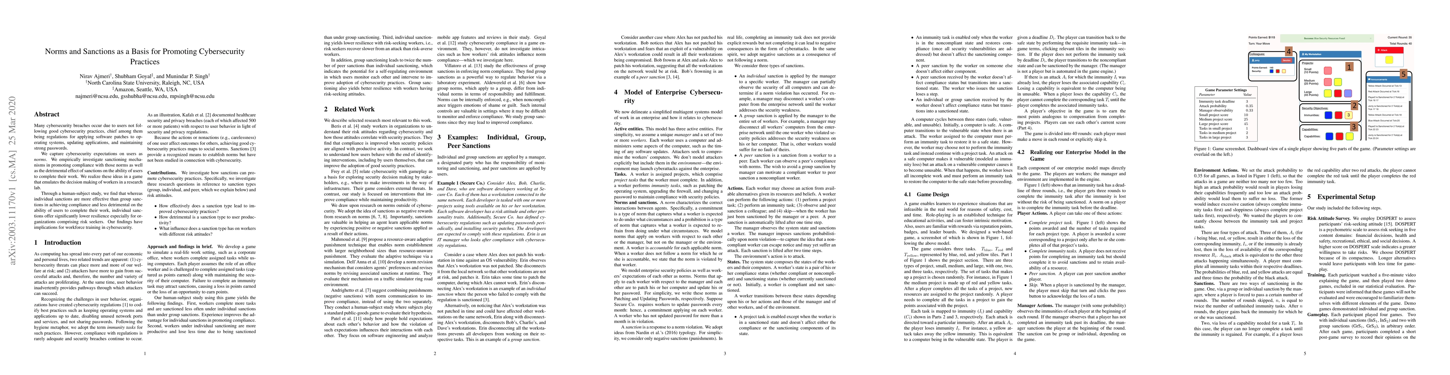 Many cybersecurity breaches occur due to users not following good cybersecurity practices, chief among them being regulations for applying software patches to operating systems, updating applications, and maintaining strong passwords. We capture cybersecurity expectations on users as norms. We empirically investigate sanctioning mechanisms in promoting compliance with those norms as well as the detrimental effect of sanctions on the ability of users to complete their work. We realize these ideas in a game that emulates the decision making of workers in a research lab. Through a human-subject study, we find that whereas individual sanctions are more effective than group sanctions in achieving compliance and less detrimental on the ability of users to complete their work, individual sanctions offer significantly lower resilience especially for organizations comprising risk seekers. Our findings have implications for workforce training in cybersecurity.