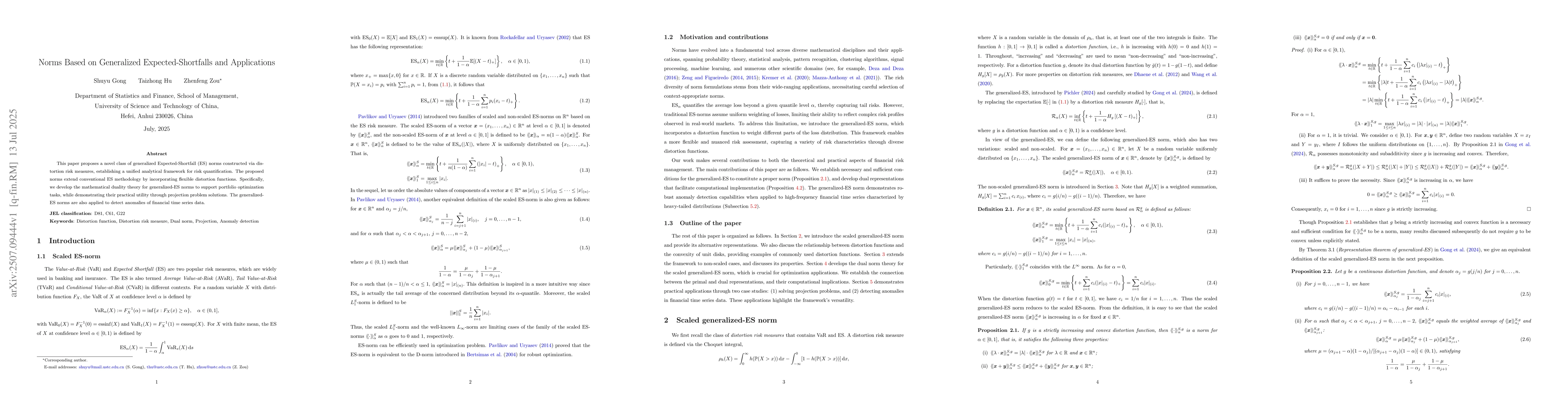 This paper proposes a novel class of generalized Expected-Shortfall (ES) norms constructed via distortion risk measures, establishing a unified analytical framework for risk quantification. The proposed norms extend conventional ES methodology by incorporating flexible distortion functions. Specifically, we develop the mathematical duality theory for generalized-ES norms to support portfolio optimization tasks, while demonstrating their practical utility through projection problem solutions. The generalizedES norms are also applied to detect anomalies of financial time series data.