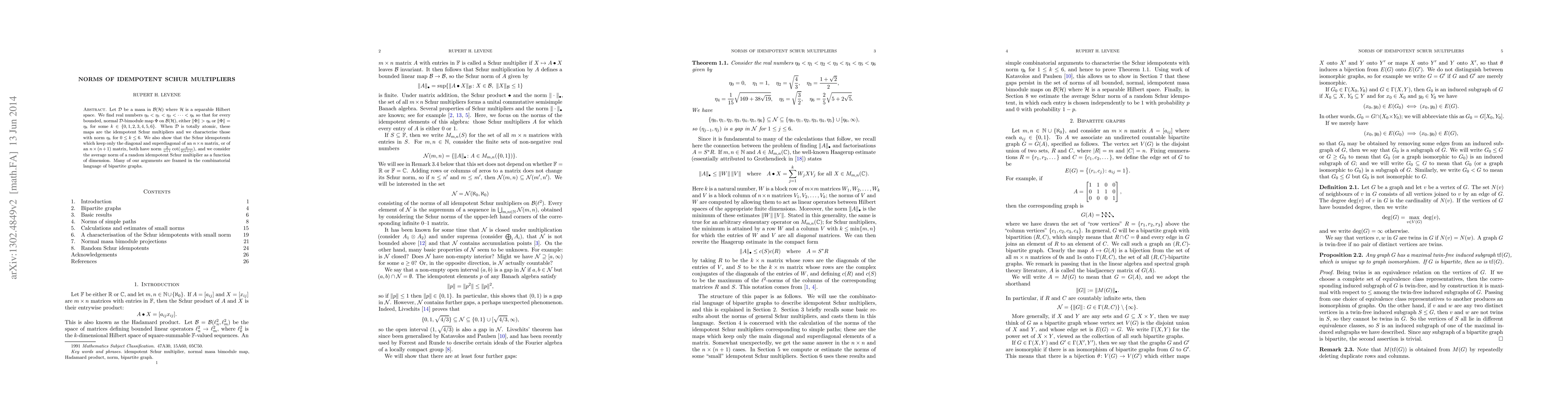 Let D be a masa in B(H) where H is a separable Hilbert space. We find real numbers \eta_0 < \eta_1 < \eta_2 < ... < \eta_6 so that for every bounded, normal D-bimodule map {\Phi} on B(H) either ||\Phi|| > \eta_6, or ||\Phi|| = \eta_k for some k <= 6. When D is totally atomic, these maps are the idempotent Schur multipliers and we characterise those with norm \eta_k for 0 <= k <= 6. We also show that the Schur idempotents which keep only the diagonal and superdiagonal of an n x n matrix, or of an n x (n+1) matrix, both have norm 2/(n+1) cot(pi/(n+1)), and we consider the average norm of a random idempotent Schur multiplier as a function of dimension. Many of our arguments are framed in the combinatorial language of bipartite graphs.