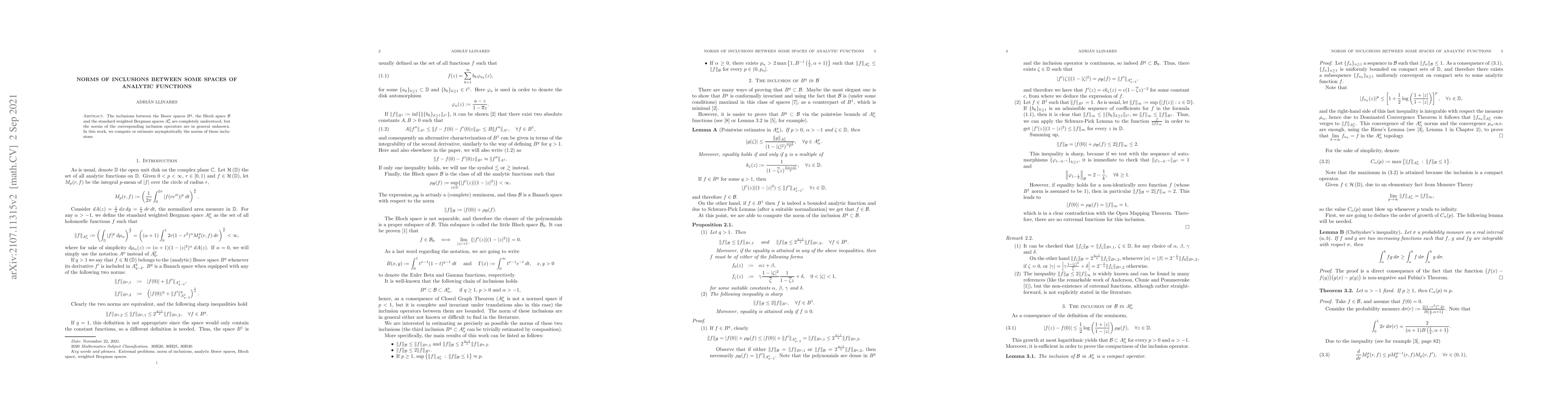 The paper computes or estimates asymptotically the norms of inclusions between analytic function spaces, such as Besov spaces, Bloch space, and weighted Bergman spaces.