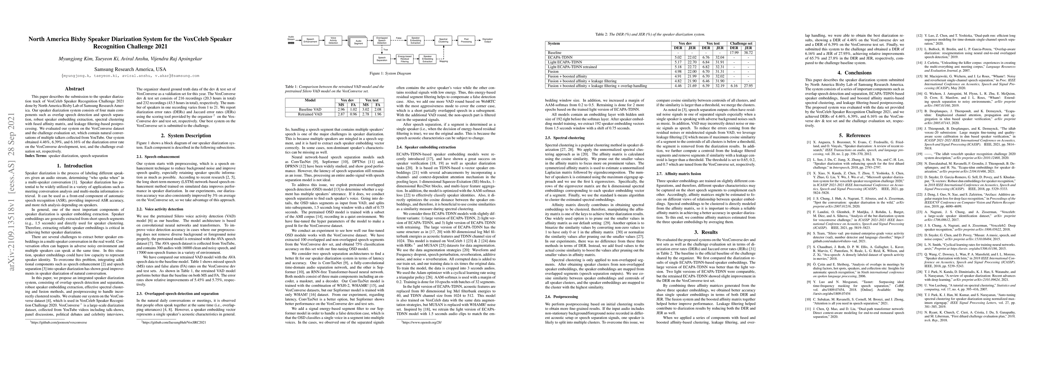 The North America Bixby Lab of Samsung Research America developed a speaker diarization system for the VoxCeleb 2021 challenge, achieving error rates of 4.46%, 6.39%, and 6.16% on respective datasets. The system integrates overlap detection, speech separation, robust embedding extraction, and spectral clustering.