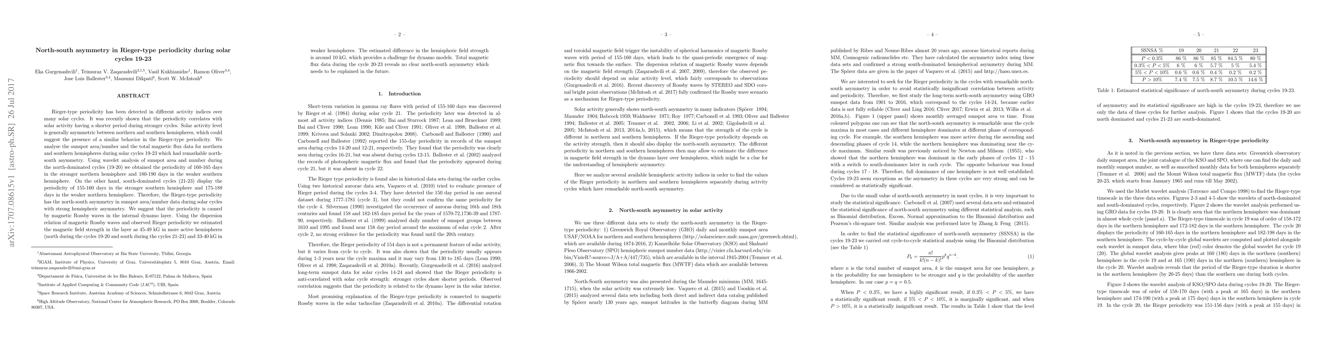 This research investigates the north-south asymmetry in Rieger-type periodicities during solar cycles 19-23, finding that stronger hemispheres exhibit shorter periodicities (160-165 days in north, 155-160 days in south), while weaker hemispheres show longer ones (180-190 days in south, 175-188 days in north). The findings suggest magnetic Rossby waves in the dynamo layer cause these periodicities, estimating stronger hemispheres' magnetic field at 45-49 kG and weaker hemispheres' at 33-40 kG.