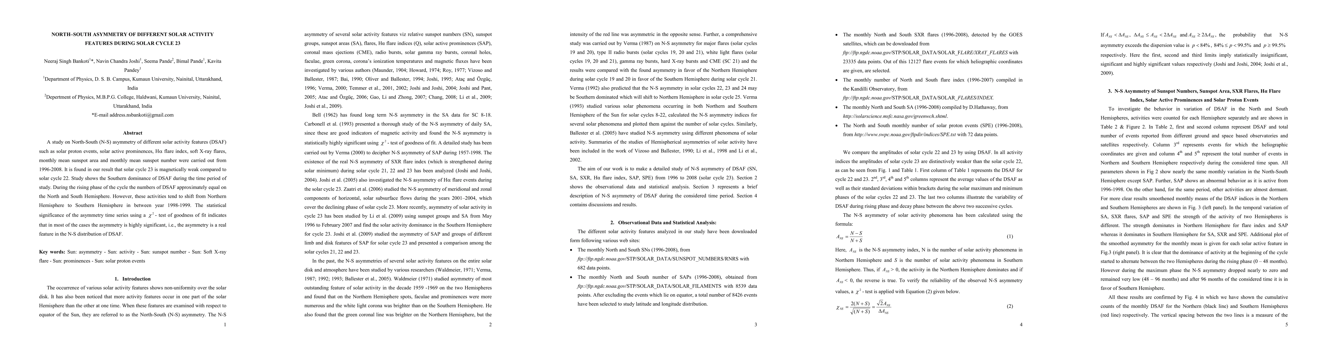 This study investigates the North-South asymmetry of various solar activity features during Solar Cycle 23 (1996-2008) and finds Southern Hemisphere dominance, with a shift from Northern to Southern activity around 1998-1999. The results indicate that Solar Cycle 23 is magnetically weaker than Cycle 22, with statistically significant asymmetry.