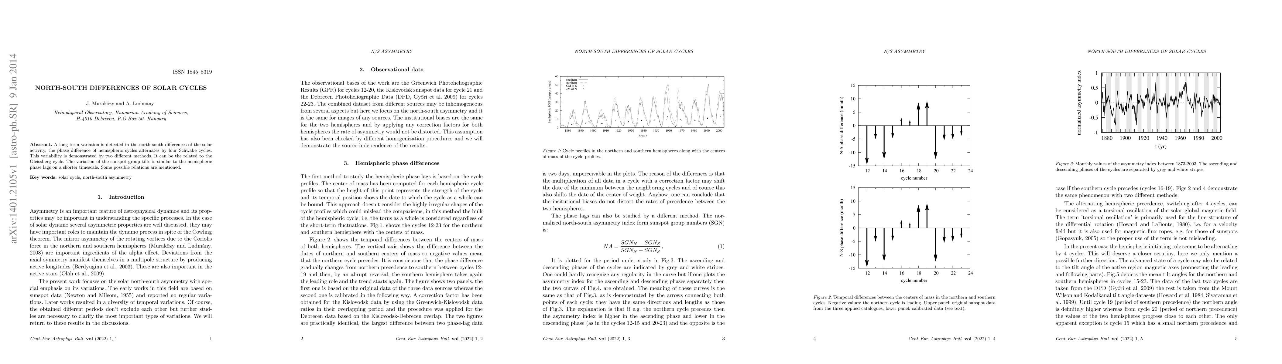 Summary: The study reveals a long-term variation in north-south differences of solar activity, with hemispheric cycles alternating every four Schwabe cycles, potentially linked to the Gleissberg cycle. The tilt of sunspot groups mirrors these hemispheric phase lags on a shorter timescale.