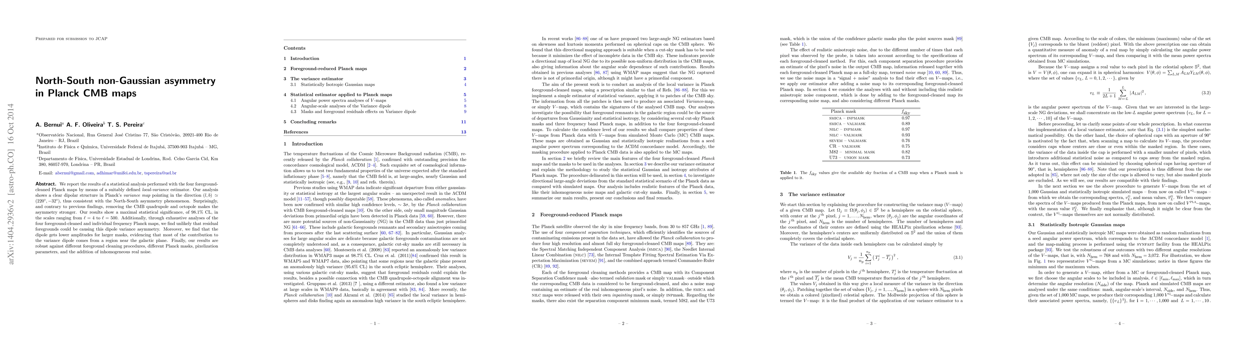 We report the results of a statistical analysis performed with the four foreground-cleaned Planck maps by means of a suitably defined {\it local-variance} estimator. Our analysis shows a clear dipolar structure in Planck's {\it variance map} pointing in the direction $(l,b) \,\simeq\, (220^{\circ},-32^{\circ})$, thus consistent with the North-South asymmetry phenomenon. Surprisingly, and contrary to previous findings, removing the CMB quadrupole and octopole makes the asymmetry stronger. Our results show a maximal statistical significance, of $98.1\%$ CL, in the scales ranging from $\ell=4$ to $\ell=500$. Additionally, through exhaustive analyses of the four foreground-cleaned and individual frequency Planck maps, we find unlikely that residual foregrounds could be causing this dipole variance asymmetry. Moreover, we find that the dipole gets lower amplitudes for larger masks, evidencing that most of the contribution to the variance dipole comes from a region near the galactic plane. Finally, our results are robust against different foreground cleaning procedures, different Planck masks, pixelization parameters, and the addition of inhomogeneous real noise.
