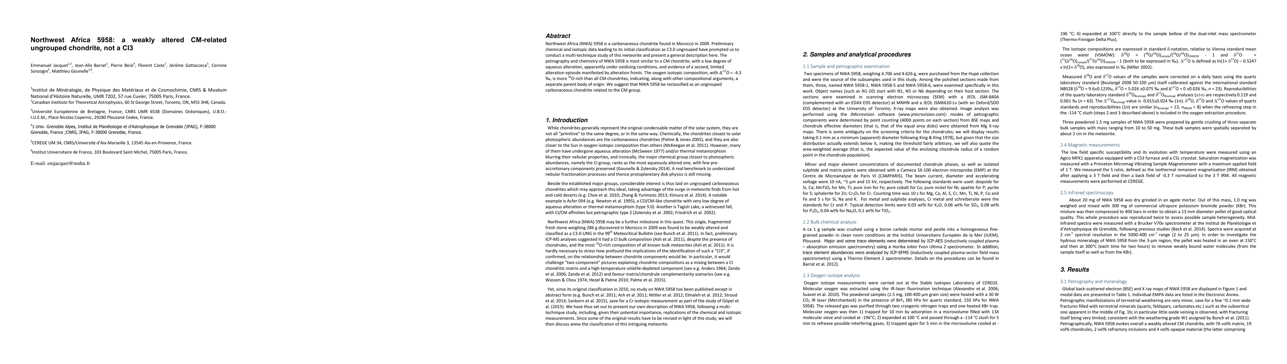 Summary: Northwest Africa 5958, initially classified as a CI3 carbonaceous chondrite, is reclassified as a weakly altered CM-related ungrouped chondrite based on its petrography, chemistry, and oxygen isotopic composition, indicating a distinct parent body origin.