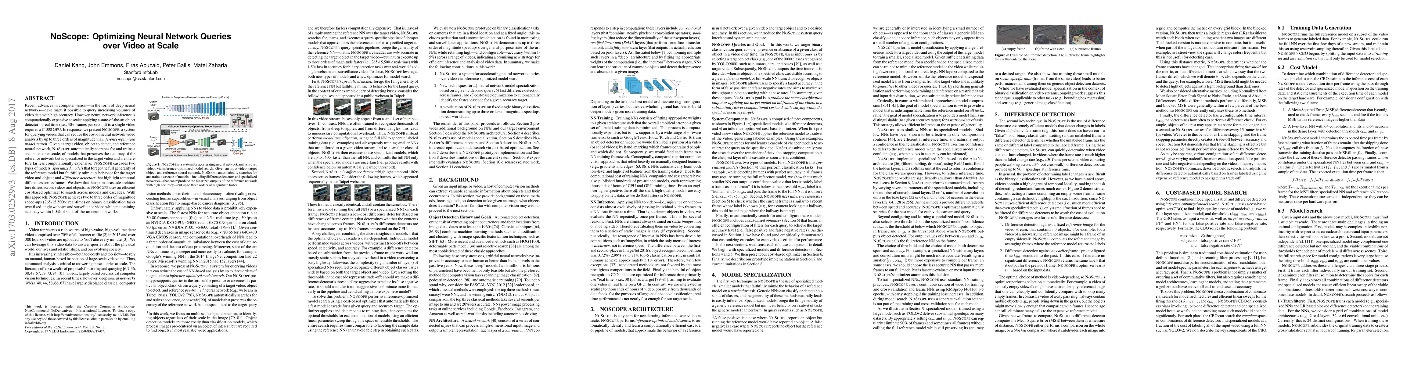 The research introduces NoScope, a system that optimizes neural network queries over video data. By automatically searching and training a sequence of models tailored to specific videos and objects, NoScope reduces computational cost by up to three orders of magnitude, achieving significant speed-ups (265-15,500x) for real-time analysis while maintaining high accuracy (within 1-5%) compared to state-of-the-art networks.