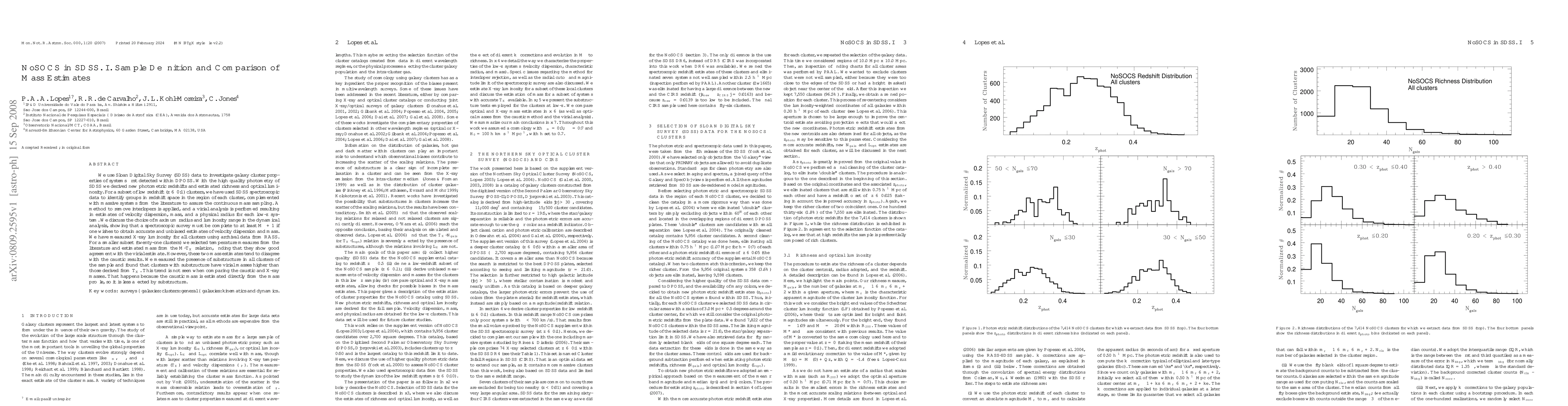 We use Sloan Digital Sky Survey (SDSS) data to investigate galaxy cluster properties of systems first detected within DPOSS. With the high quality photometry of SDSS we derived new photometric redshifts and estimated richness and optical luminosity. For a subset of low redshift ($z \le 0.1$) clusters, we have used SDSS spectroscopic data to identify groups in redshift space in the region of each cluster, complemented with massive systems from the literature to assure the continuous mass sampling. A method to remove interlopers is applied, and a virial analysis is performed resulting in estimates of velocity dispersion, mass, and a physical radius for each low-$z$ system. We discuss the choice of maximum radius and luminosity range in the dynamical analysis, showing that a spectroscopic survey must be complete to at least M$^*+1$ if one wishes to obtain accurate and unbiased estimates of velocity dispersion and mass. We have measured X-ray luminosity for all clusters using archival data from RASS. For a smaller subset (twenty-one clusters) we selected temperature measures from the literature and estimated mass from the M-T$_X$ relation, finding that they show good agreement with the virial estimate. However, these two mass estimates tend to disagree with the caustic results. We measured the presence of substructure in all clusters of the sample and found that clusters with substructure have virial masses higher than those derived from T$_X$. This trend is not seen when comparing the caustic and X-ray masses. That happens because the caustic mass is estimated directly from the mass profile, so it is less affected by substructure.