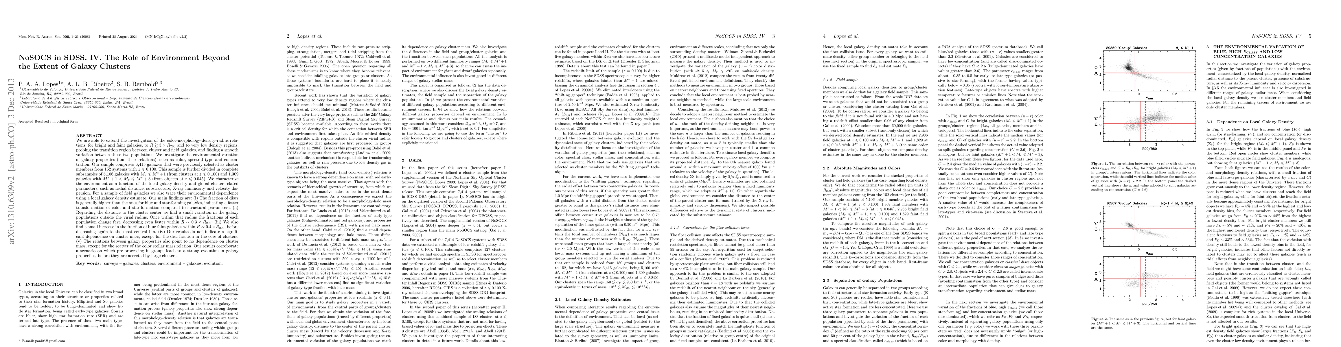 We are able to extend the investigation of the color-morphology-density-radius relations, for bright and faint galaxies, to $R \gtrsim 3 \times R_{200}$ and to very low density regions, probing the transition region between cluster and field galaxies, and finding a smooth variation between these two populations. We investigate the environmental variation of galaxy properties (and their relations), such as color, spectral type and concentration. Our sample comprises 6,415 galaxies that were previously selected as cluster members from 152 systems with $z \le 0.100$. Our main findings are: (i) The fraction of discs is generally higher than the ones for blue and star-forming galaxies, indicating a faster transformation of color and star-formation compared to structural parameters. (ii) Regarding the distance to the cluster center we find a small variation in the galaxy populations outside the virial radius. Once within that radius the fractions of each population change fast, decreasing even faster within $R \sim 0.3 \times R_{200}$. (iii) We also find a small increase in the fraction of blue faint galaxies within $R \sim 0.4 \times R_{200}$, before decreasing again to the most central bin. (iv) Our results do not indicate a significant dependence on cluster mass, except for the disc fraction in the core of clusters. (v) The relations between galaxy properties also point to no dependence on cluster mass, except for the scatter of the color stellar mass relation. Our results corroborate a scenario on which pre-processing in groups leads to a strong evolution in galaxy properties, before they are accreted by large clusters (abridged).